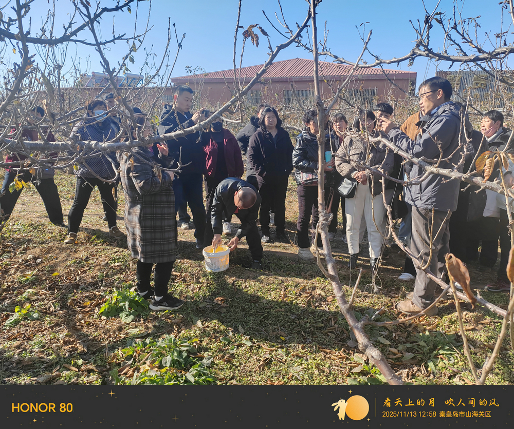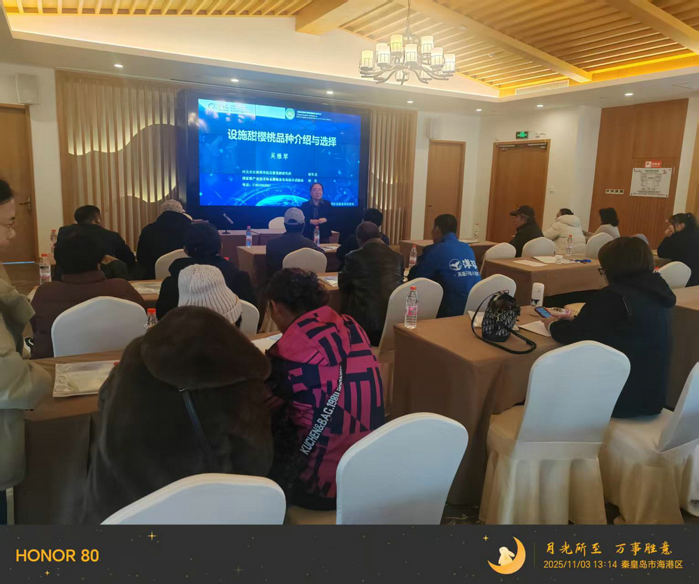 2025年10月22日-11月13日,昌黎果树研究所樱桃团队结合高素质农民培训在山海关区、海港区、昌黎果树研究所施各庄示范基地开展了4次甜樱桃栽培技术及病虫害绿色防控技术培训。樱桃与生物技术研究室主任、陈龙副研究员围绕“甜樱桃品种及整形修剪技术”进行了讲解,国家桃产业技术体系樱桃秦皇岛综合试验站站长吴雅琴研究员围绕“甜樱桃冻害、裂果及病虫害绿色防控技术”、“设施甜樱桃品种介绍与选择”等内容进行了培训,山海关区、海港区果农共120人参加了此次培训。