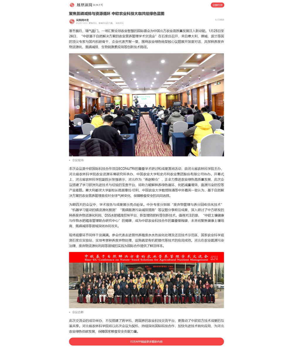 寒冬腊月,瑞气盈门。一场汇聚全球农业智慧的国际盛会为中国北方农业高质量发展注入新动能。1月25日至28日,“中欧基于自然解决方案的农业营养管理学术交流会”在石家庄召开,来自意大利、挪威、波兰等国的顶尖专家与国内科研骨干、企业代表齐聚一堂,围绕农业绿色转型核心议题展开深度对话,共探种养废弃物资源化、氮磷减排、生物刺激素应用等创新技术路径。