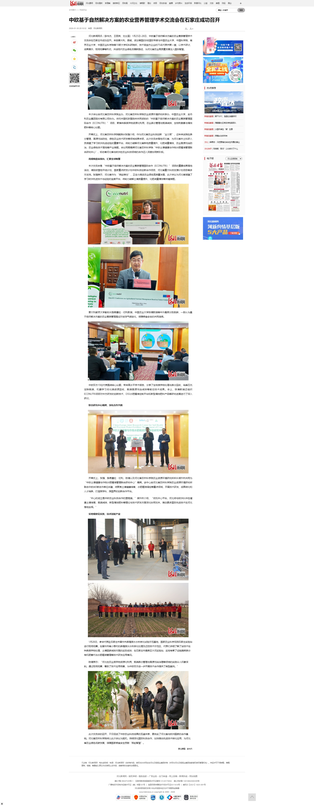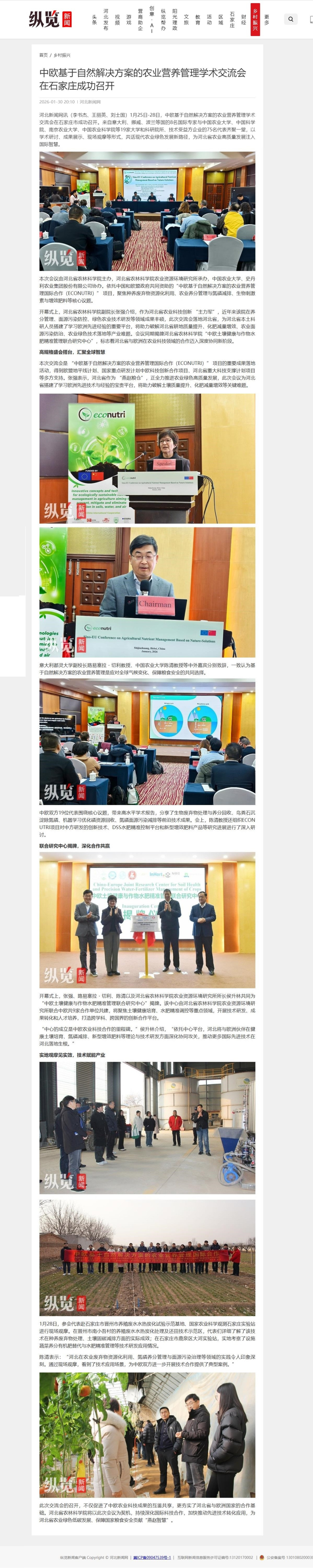 河北新闻网讯(李书杰、王丽英、刘士国)1月25日-28日,中欧基于自然解决方案的农业营养管理学术交流会在石家庄市成功召开。来自意大利、挪威、波兰等国的8名国际专家与中国农业大学、中国科学院、南京农业大学、中国农业科学院等19家大学和科研院所、技术受益方企业的75名代表齐聚一堂,以学术研讨、成果展示、现场观摩等形式,共话现代农业绿色发展新路径,为河北省农业高质量发展注入国际智慧。