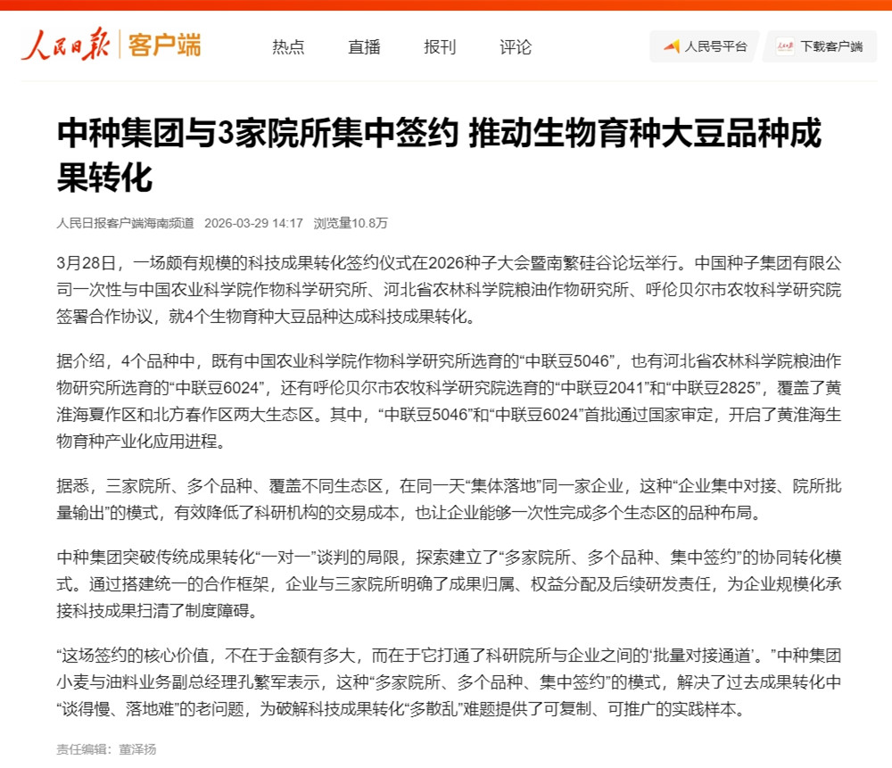 3月28日,一场颇有规模的科技成果转化签约仪式在2026种子大会暨南繁硅谷论坛举行。中国种子集团有限公司一次性与中国农业科学院作物科学研究所、河北省农林科学院粮油作物研究所、呼伦贝尔市农牧科学研究院签署合作协议,就4个生物育种大豆品种达成科技成果转化。