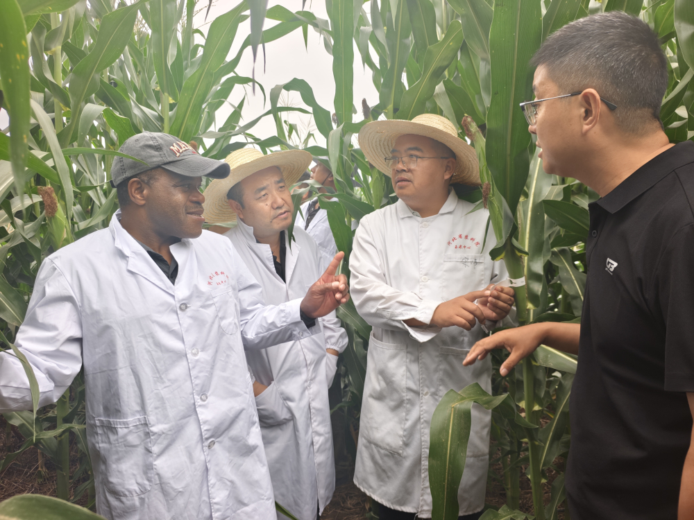 Meanwhile, Dr. Thanda paid a visit to the tropical germplasm resource identification nursery located at the experimental station of the Institute of Cereal and Oil Crops. After listening to the introduction on molecular assisted breeding and important trait localization in maize, as well as the field planting and phenotype investigation of tropical maize inbred lines introduced from CIMMYT, Dr. Dhliwayo compared and analyzed the performance differences of these tropical maize germplasms in Mexico and the Huang-Huai-Hai region, pointed out the advantages and disadvantages, and proposed using temperate germplasms for two backcrosses and strict screening to obtain improved germplasms that suitable for the local environment.