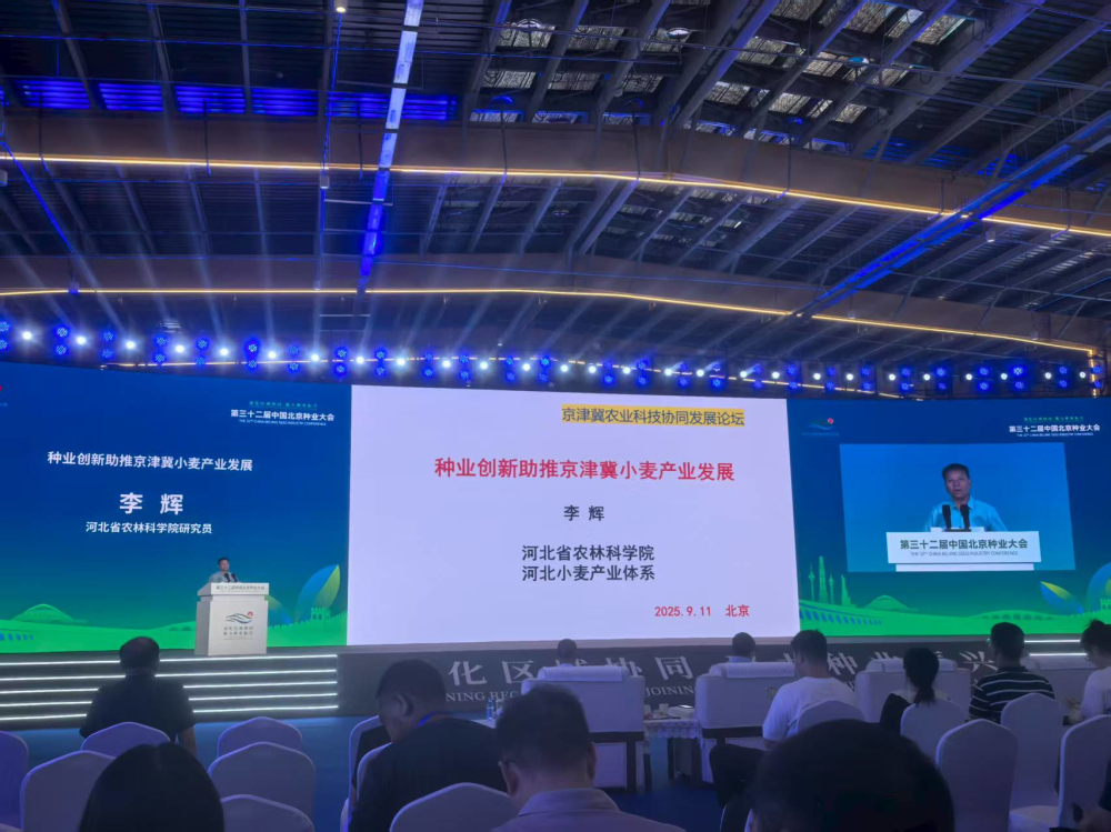The conference was held concurrently with the forum on the Coordinated Development of Agricultural Science and Technology in the Beijing-Tianjin-Hebei region. Researcher LI Hui from the Institute of Cereal and Oil Crops, HAAFS was invited to deliver a keynote report entitled "Seed Industry Innovation Boosts the Development of Wheat Industry in the Beijing-Tianjin-Hebei Region". This forum released 103 leading agricultural varieties for the coordinated development of the Beijing-Tianjin-Hebei region, including wheat variety Jimai 765, peanut variety Jihua 19, and pear variety Jixiu, as well as 90 key promoted agricultural technologies for the coordinated development of the Beijing-Tianjin-Hebei region, such as "Alfalfa and dry-alkali tolerant wheat rotation technology on saline-alkali land", "intelligent and mechanized production technology of cotton-wheat intercropping", and "ecological cultivation technology of forsythia suspensa", and awarded plaques to the core demonstration bases of the Beijing-Tianjin-Hebei Agricultural Science and Technology Innovation Alliance.