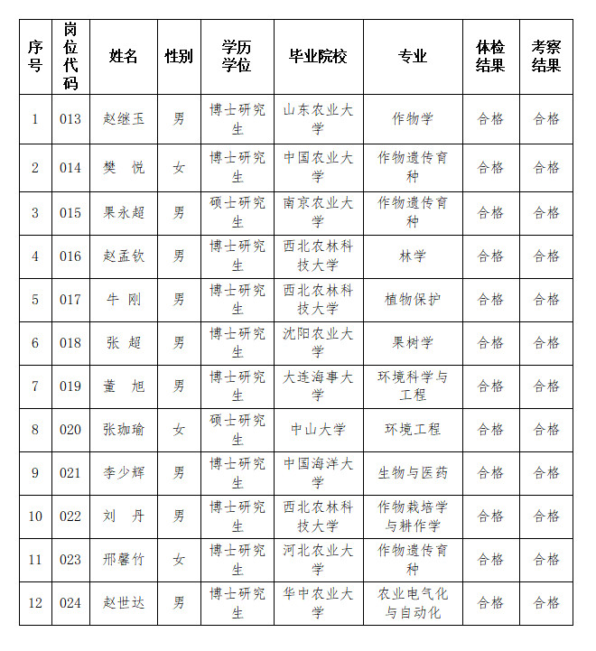 根据《河北省事业单位公开招聘工作人员暂行办法》和《河北省农林科学院直属事业单位2025年选聘工作人员公告》,经报名资格审查、面试、体检、考察等程序,确定以下12人为拟聘人员,现予以公示: