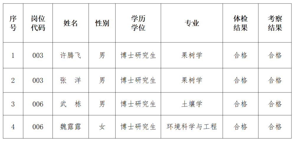 根据《河北省事业单位公开招聘工作人员暂行办法》和《河北省农林科学院直属事业单位2025年选聘工作人员公告》,经报名资格审查、面试、体检、考察等程序,确定以下4人为拟聘人员,现予以公示: