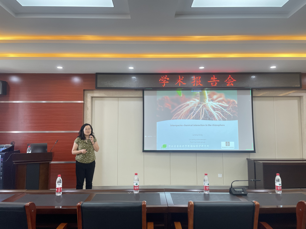 Bouwmeester教授做了题为“Elucidating rhizosphere signaling in crops for a sustainable agriculture”的学术报告,介绍了阿姆斯特丹大学和其研究团队的基本情况,阐述了植物根系分泌物招募有益微生物群落,并促进植物对病原菌的抗病能力等方面研究内容。董乐萌博士做了题为“Interspecies chemical interaction in the rhizosphere”的学术报告,重点介绍了在缺氮条件下,植物中产生的物质与线虫和微生物互作效应等方面内容。为今后开展科研工作拓展了思路,对新试验技术的应用提供了借鉴。