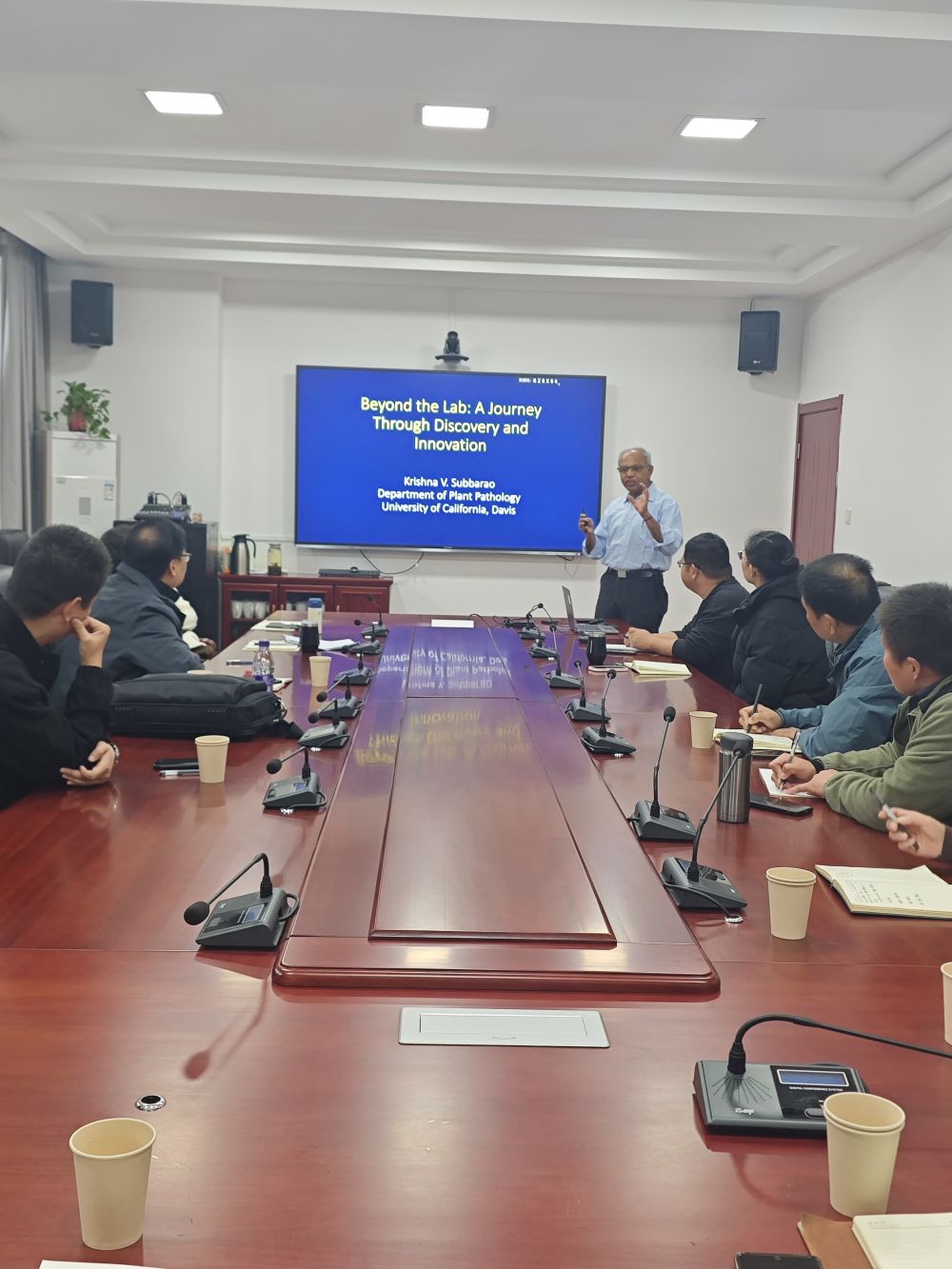 近日,应植保所邀请,《Phytopathology》(《美国植物病理学报》)前主编、加州大学戴维斯分校植物病理学系 Krishna V. Subbarao 教授来访,并作题为 “Beyond the Lab: A Journey Through Discovery and Innovation”的学术报告。