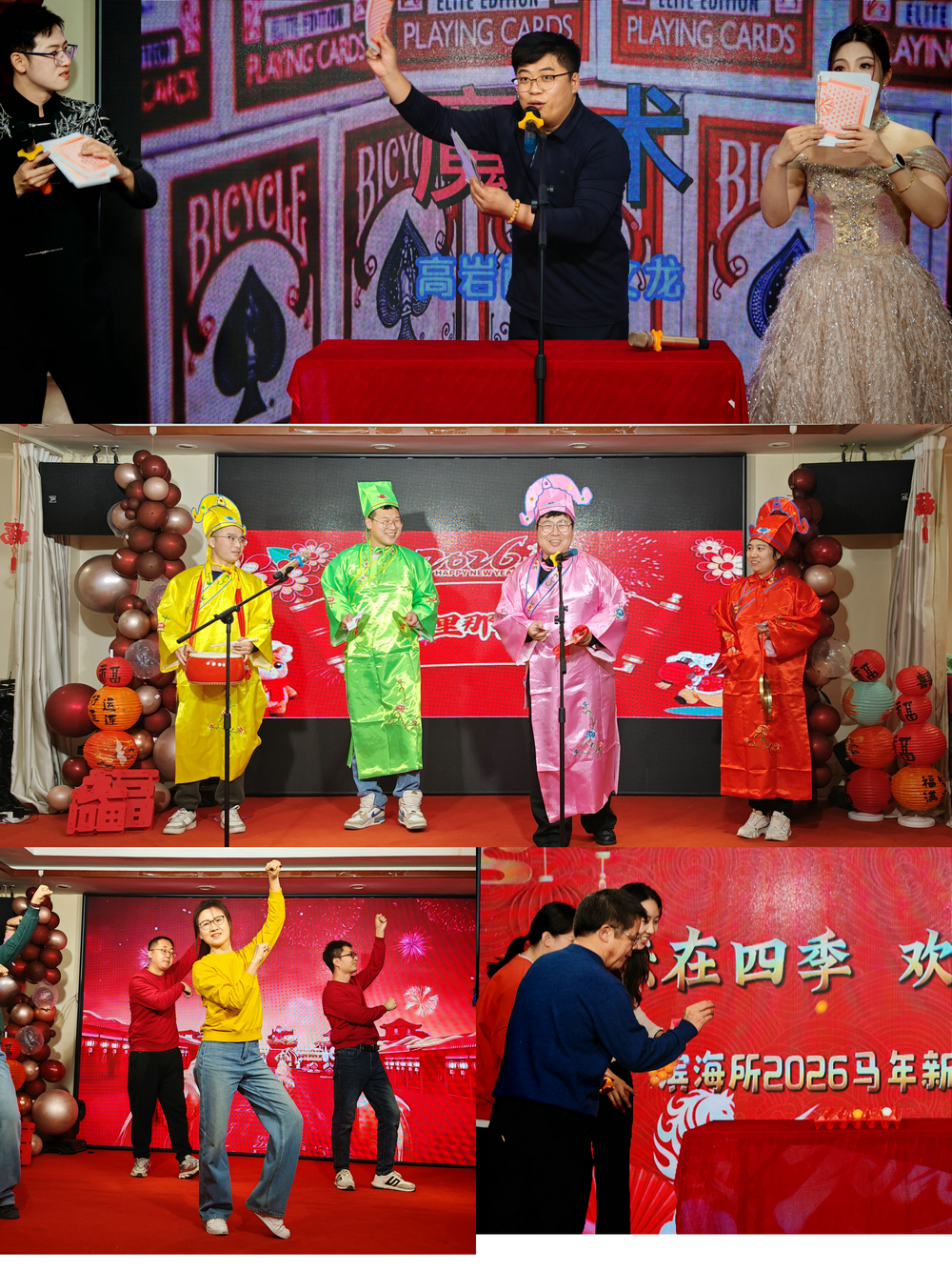整场联欢会节目均由职工自编自导自演,融思想性、艺术性、趣味性于一体,充分展现了滨海人昂扬向上、团结奋进的精神面貌。小合唱《我们都是追梦人》节奏明快、活力满满,尽显年轻人的朝气与奋进;三句半《所里那点事》以幽默接地气的演绎,生动再现农科人扎根试验田、潜心搞研究的坚守与奉献;诗朗诵《八十载,山河铭记》深情回望峥嵘岁月,歌颂几代人的坚守、拼搏与牺牲,凝聚了继往开来,传递薪火的力量。器乐演奏、亲子合唱、相声、魔术等轮番上阵,温情与活力交织,掌声与喝彩不断。活动现场还穿插互动游戏,猜灯谜等环节,趣味十足,暖意融融,进一步拉进职工间的距离,增强了团队凝聚力与归属感。