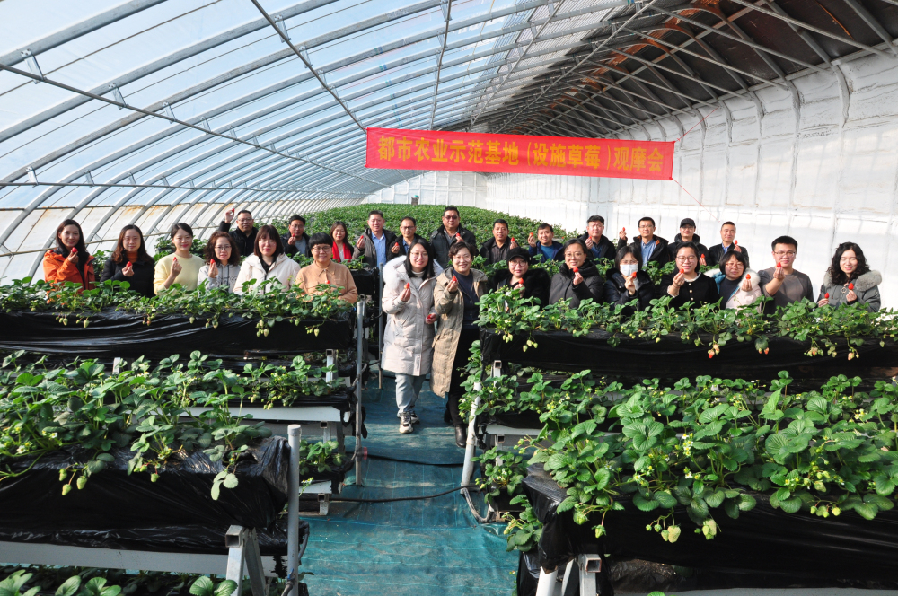 农业信息与经济研究所所长郑小六介绍了研究所学科发展中都市农业研究的亮点和面临的挑战,借此观摩会展示部分成果,征得各方支持,助力研究水平进一步提升。观摩现场,与会人员观摩了用新型材料装配的日光温室以及草莓立体种植、基质栽培、优良品种、生物防控、智能化管控等先进技术,品尝了先进技术集成生产的优质草莓,体验了立架式草莓采摘,石家庄果树所杨雷主任讲解了该基地种植草莓所应用的一系列关键技术,他认为,应用先进的科学技术种植草莓非常契合都市农业发展要求。辛集农业农村局孟钊副书记提出,融入休闲旅游元素,结合农田景观,利用基地门户空间,将保高丰农场打造成一个集观光性、娱乐性、休闲性、科普性与体验性为一体的特色都市农业示范样板。