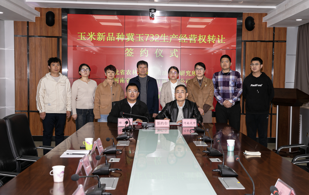 4月3日,粮油作物研究所与河南省天中种子有限责任公司在石家庄市举行“冀玉732”玉米新品种经营权转让签约仪式。粮油作物研究所书记李辉、玉米中心主任宋炜、河南省天中种子有限责任公司总经理路向阳、海南芙锐思植物新品种科技发展有限公司代表许蒙蒙等参加了签约仪式。