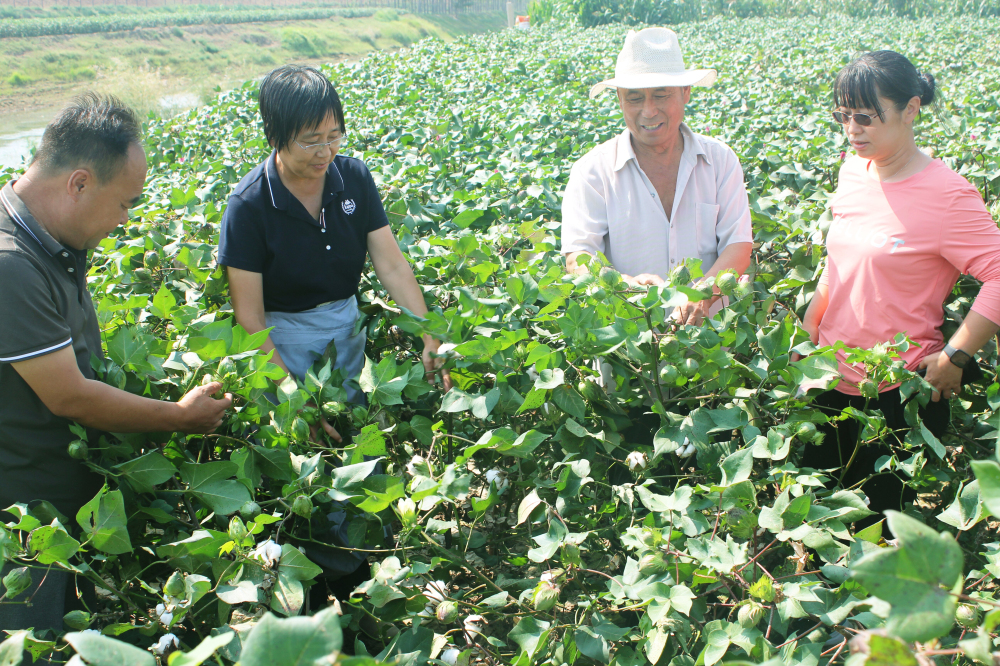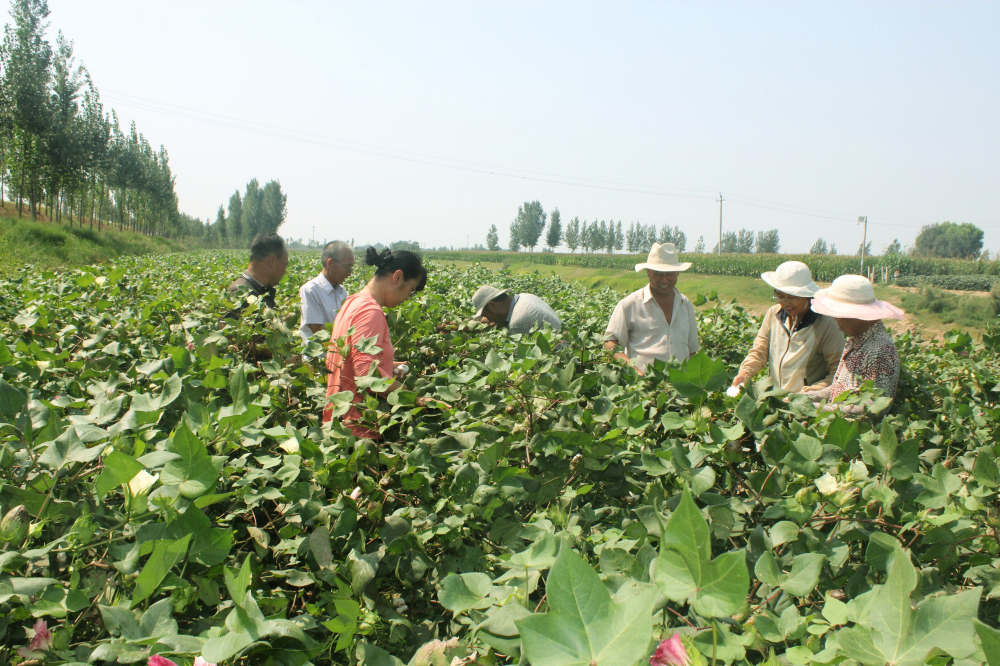 为加强棉花后期管理,做好棉花新品种示范推广工作,9月4日,棉花所科技人员赴邢台巨鹿开展示范品种实地考察和田间技术指导。 科技人员对示范棉花新品种的植株长势、结铃、吐絮等情况进行了调查,对种植户就促早熟、及时收获、控制“三丝”等棉花吐絮期管理措施进行了技术指导并发放相关技术资料。本次生产技术指导工作为促进新品种推广起到积极推动作用。