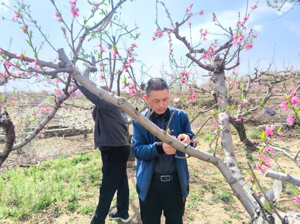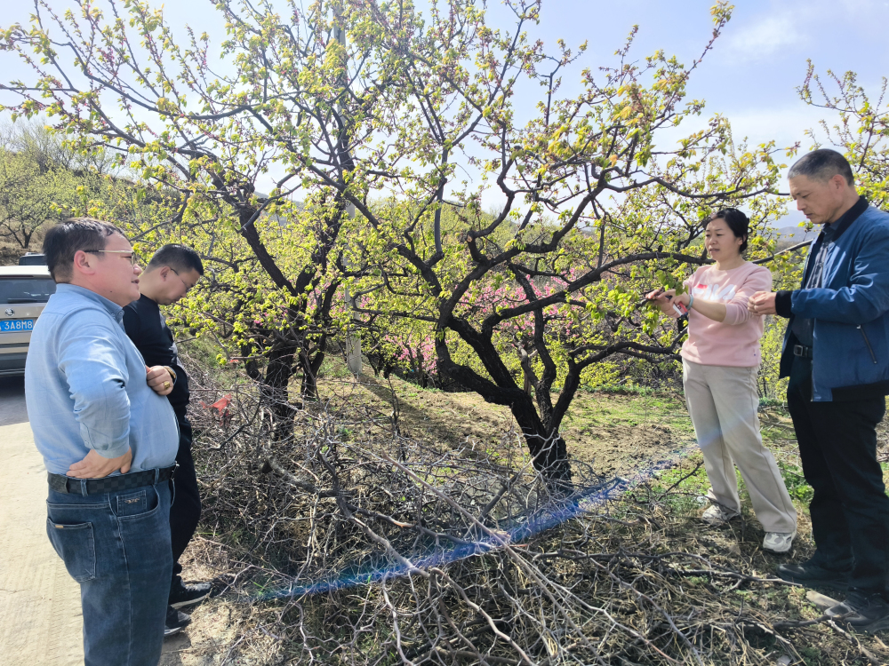 我省3月27~29日发生的霜冻天气对部分果树产生危害。为更好的搞好赞皇县特色果树小镇项目建设,2025年4月1日石家庄果树研究所组织果树专家马文会研究员、武晓红研究员等到赞皇土门乡进行了果树花期霜冻情况调查。专家现场问询了相关农户果园霜冻发生情况,调查了樱桃、桃、杏等花和幼果受冻情况。随后就部分受冻果树后期管理进行了技术指导。总体上本次霜冻对土门乡果树危害较小,除个别低洼地霜冻较严重外,其他果树多数仅发生轻微霜冻,对果树生产影响不大。 土门乡政府相关人员陪同果树霜冻调查工作。