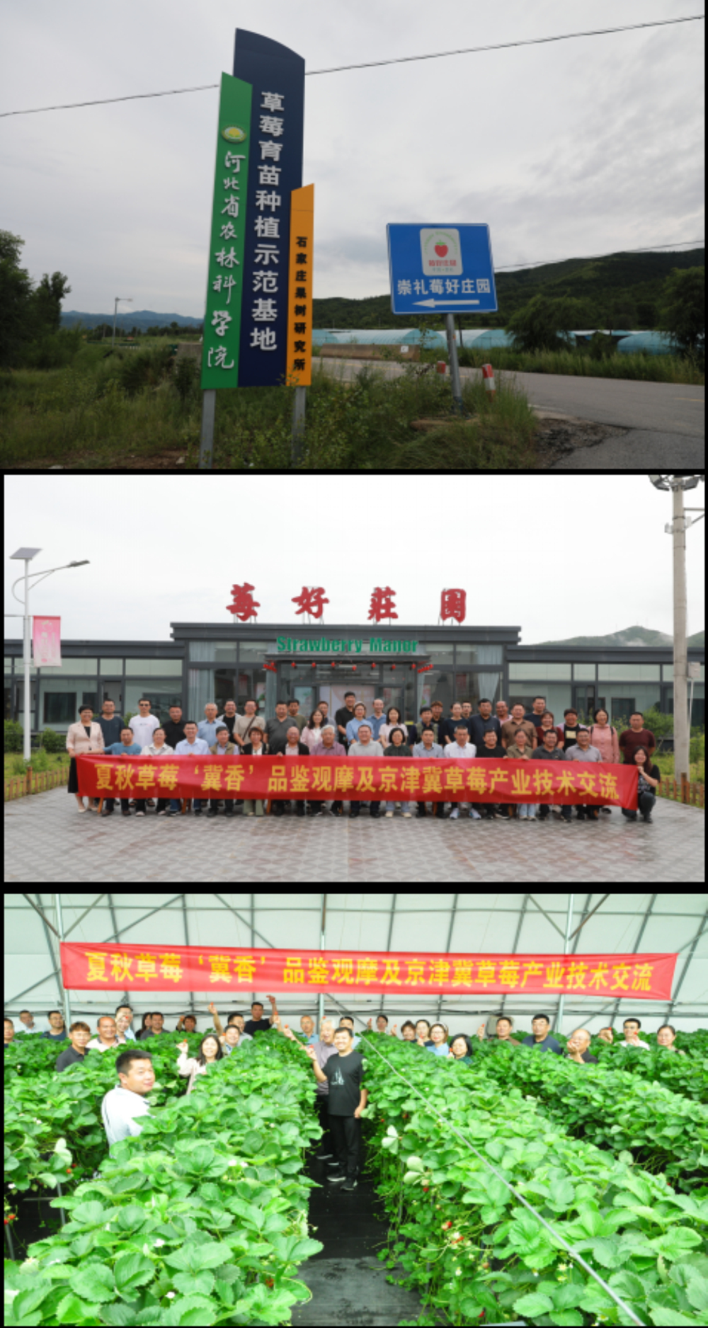 自2022年起,草莓创新团队与张家口崇礼莓好生态科技有限公司及河北涞源高地农业科技有限公司进行四季草莓新品种‘冀香’及绿色生产技术应用与示范,取得了显著成效。2022年至2025年张家口崇礼区老芽茬村‘莓好庄园’及保定涞源县白石山村‘高地农业’试验示范了优质、丰产、抗病、耐贮运四季草莓新品种‘冀香’,两个基地均采用了稻壳及秸秆改良土壤,充分利用有机肥,疏花疏果,蜜蜂辅助授粉,黄板诱杀蚜虫、蓝板诱杀蓟马,异色瓢虫防控蚜虫,捕食螨防控红蜘蛛等绿色生产技术手段,保证了生产出的草莓果品绿色、优质、安全。两个基地的公司分别与河北省农林科学院石家庄果树研究所签订了‘冀香’品种经营权转让协议。