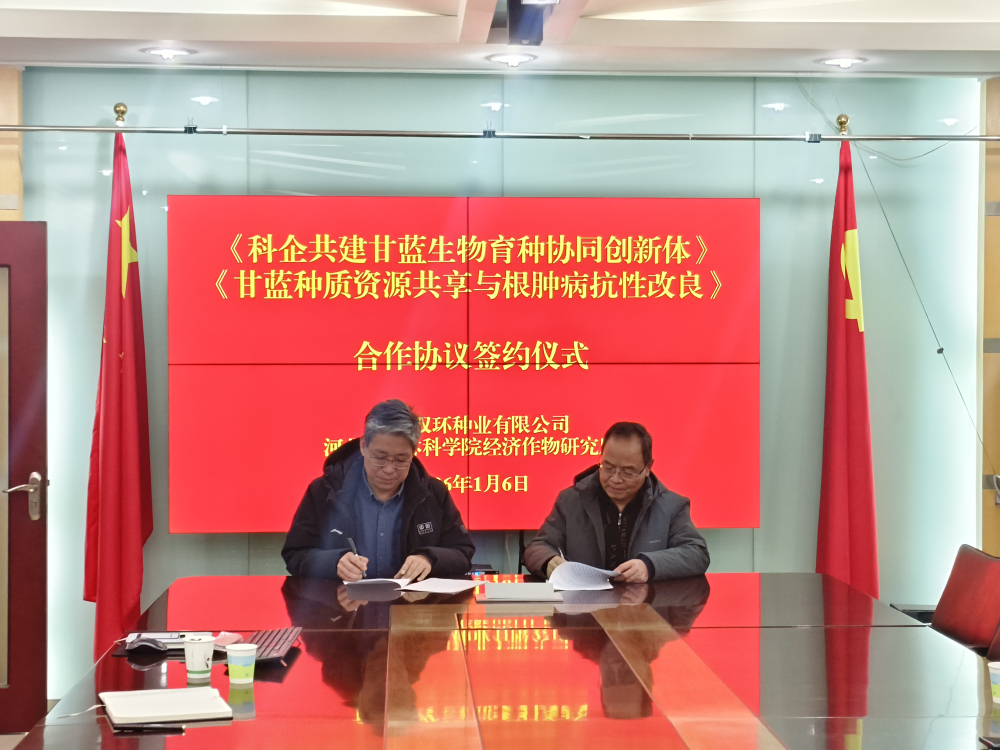 为落实国家创新驱动发展战略,加速科技创新与产业创新多维度深度融合,2026年1月6日,经作所与邢台双环种业有限公司签订了《科企共建甘蓝生物育种协同创新体系合作协议》。邢台双环种业有限公司董事长于海欧、副总经理于天然、办公室主任任俊玲,经作所所长王明秋、副所长严立斌、副所长刘晓东和功能合成与改良研究室成员出席签约仪式。