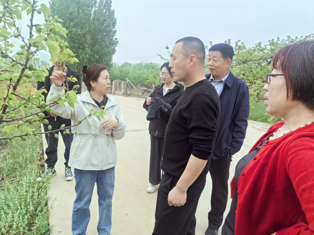 在示范基地杏园,团队重点调查了基地内新品种的坐果表现和嫁接成活质量。调查发现,今年杏树上草履蚧发生较为严重,部分植株枝干可见大量虫体聚集;蚜虫危害相对较轻,尚在可控范围内。针对草履蚧的偏重发生态势,团队现场提出防治建议,指出应抓住关键时期及时采取物理或化学防控措施,避免虫害蔓延影响树体正常生长及后续杏果质量和产量。