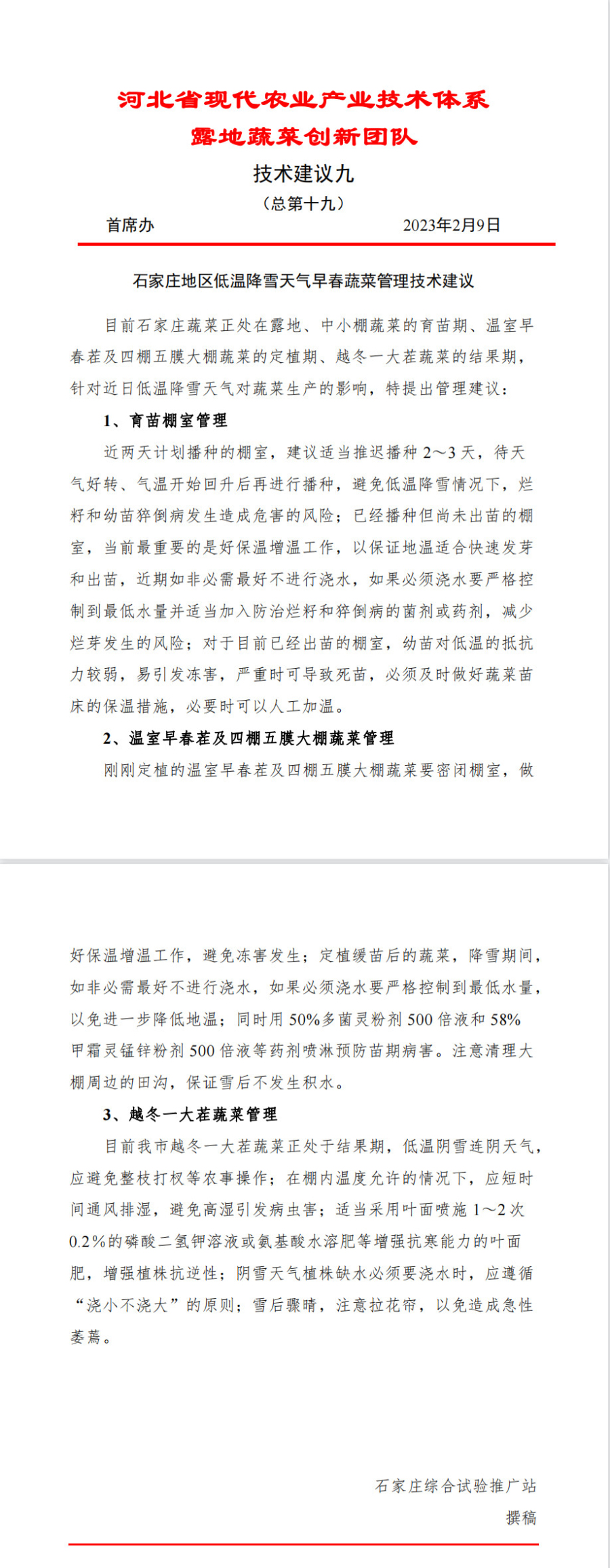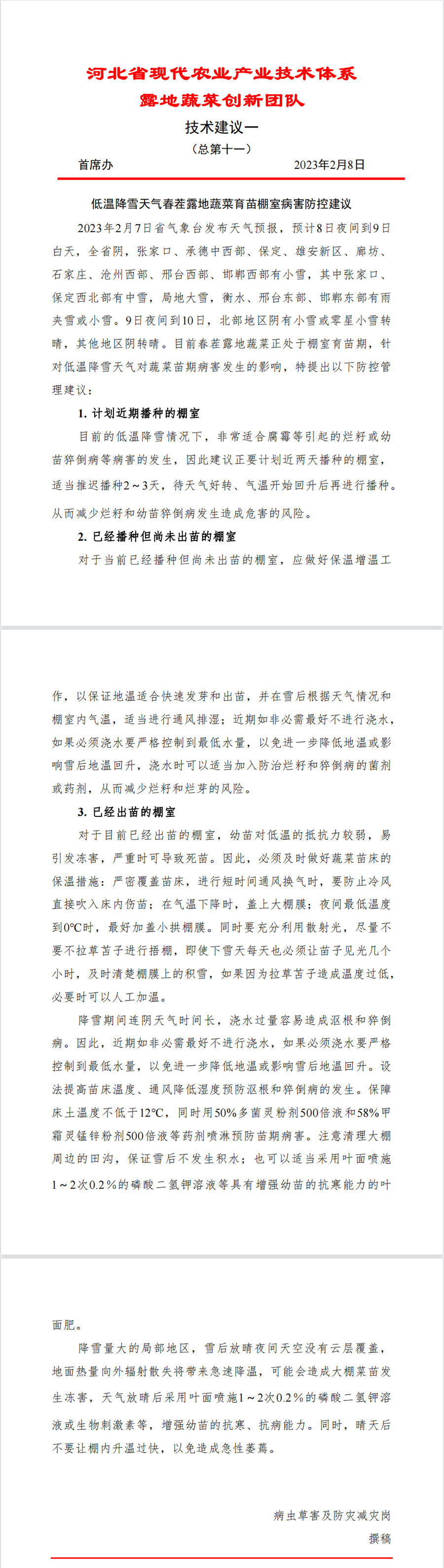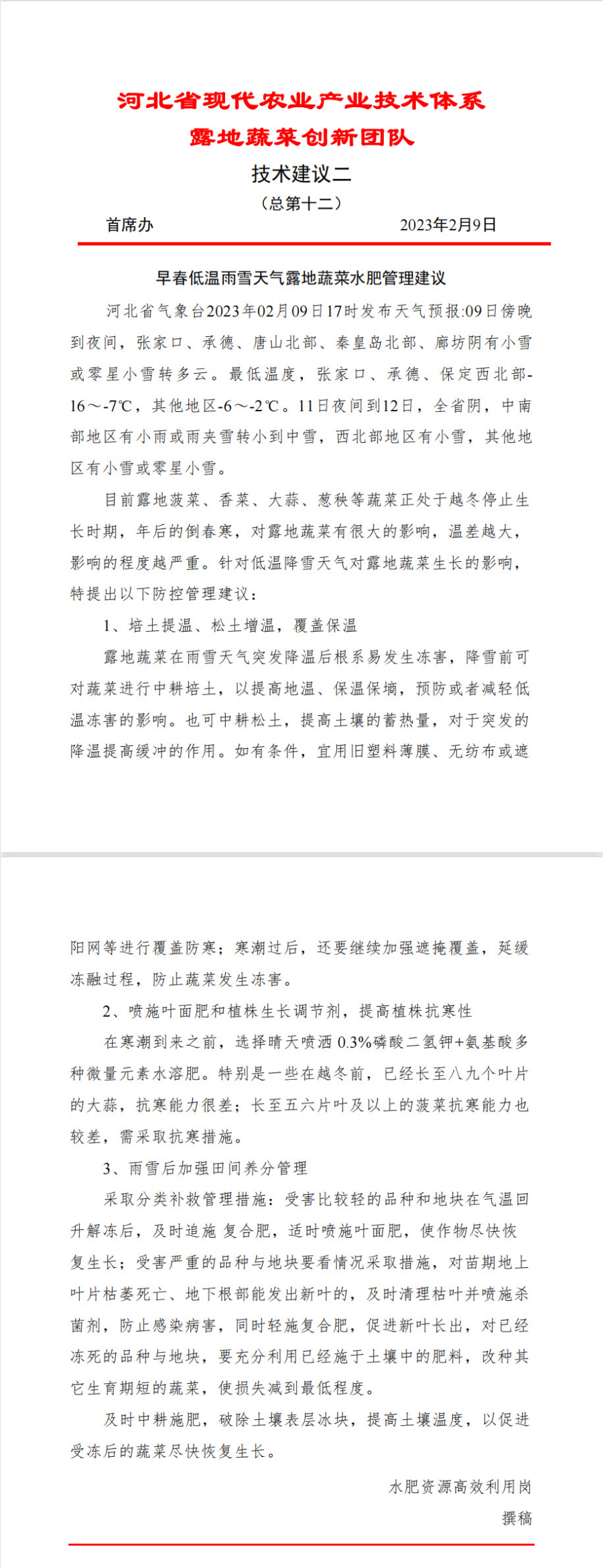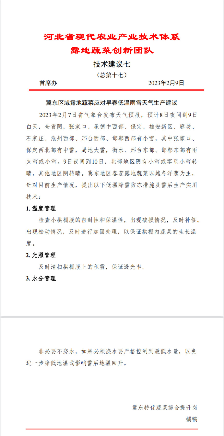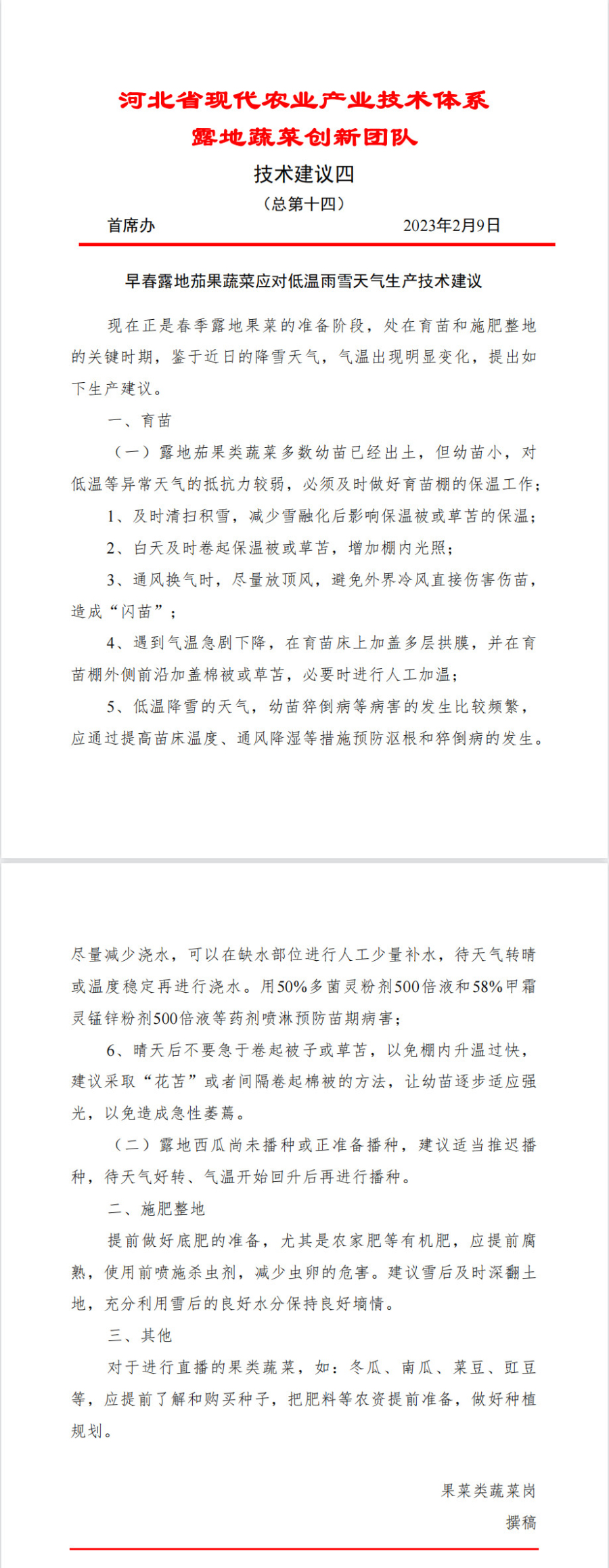 根据省气象台天气预报,受冷空气影响,预计8日夜间到9日夜间,我省有降雪天气,其中西北部地区局地有大雪。12日前后,中南部地区还有一次雨雪天气。13-14日,全省大部分地区最低气温有所下降。 针对此次雨雪天气可能对早春蔬菜生产造成影响,依托我院信息与经济所的省产业体系露地蔬菜创新团队,紧急组织团队岗位专家及试验站长,制定了科学应对低温雨雪防冻“套餐配方技术”十项,并布署各岗站专家持续关注当前天气对蔬菜生产的影响,加强我省蔬菜产区生产和销售全产业链条的技术指导,助力春季蔬菜健康生产。