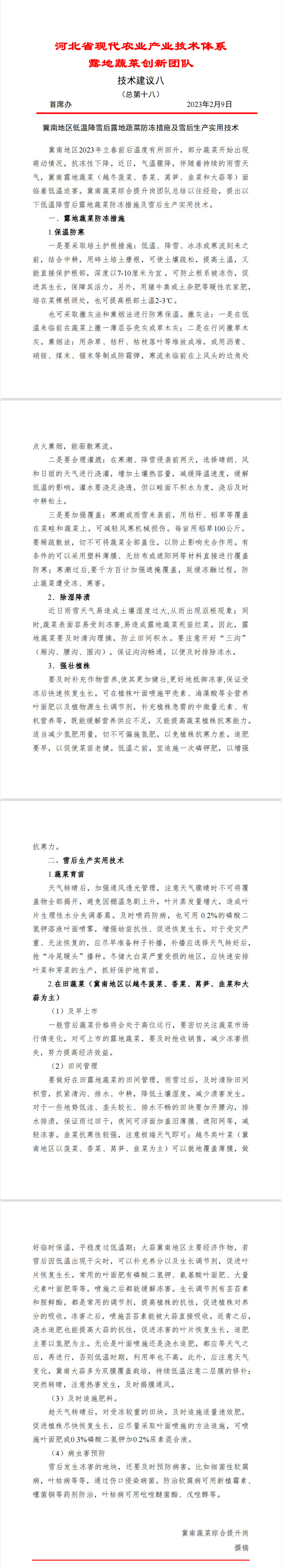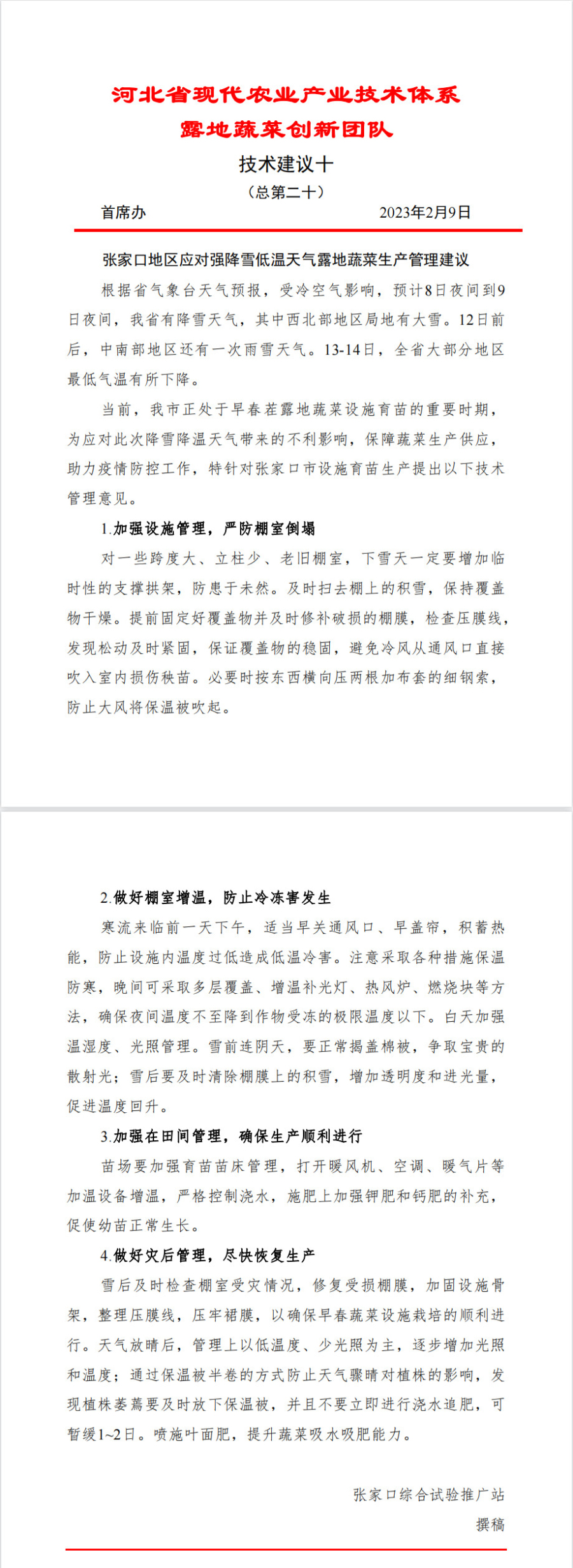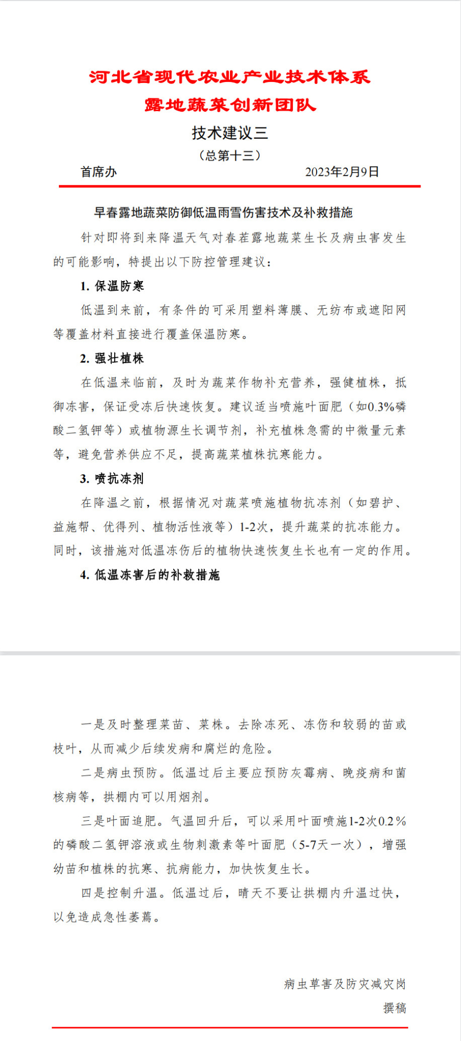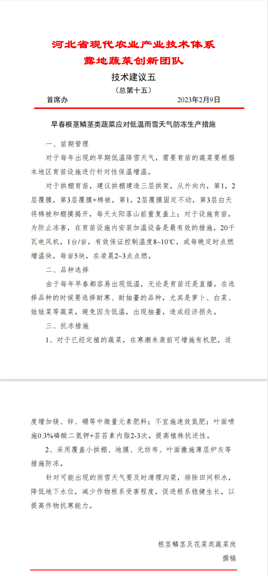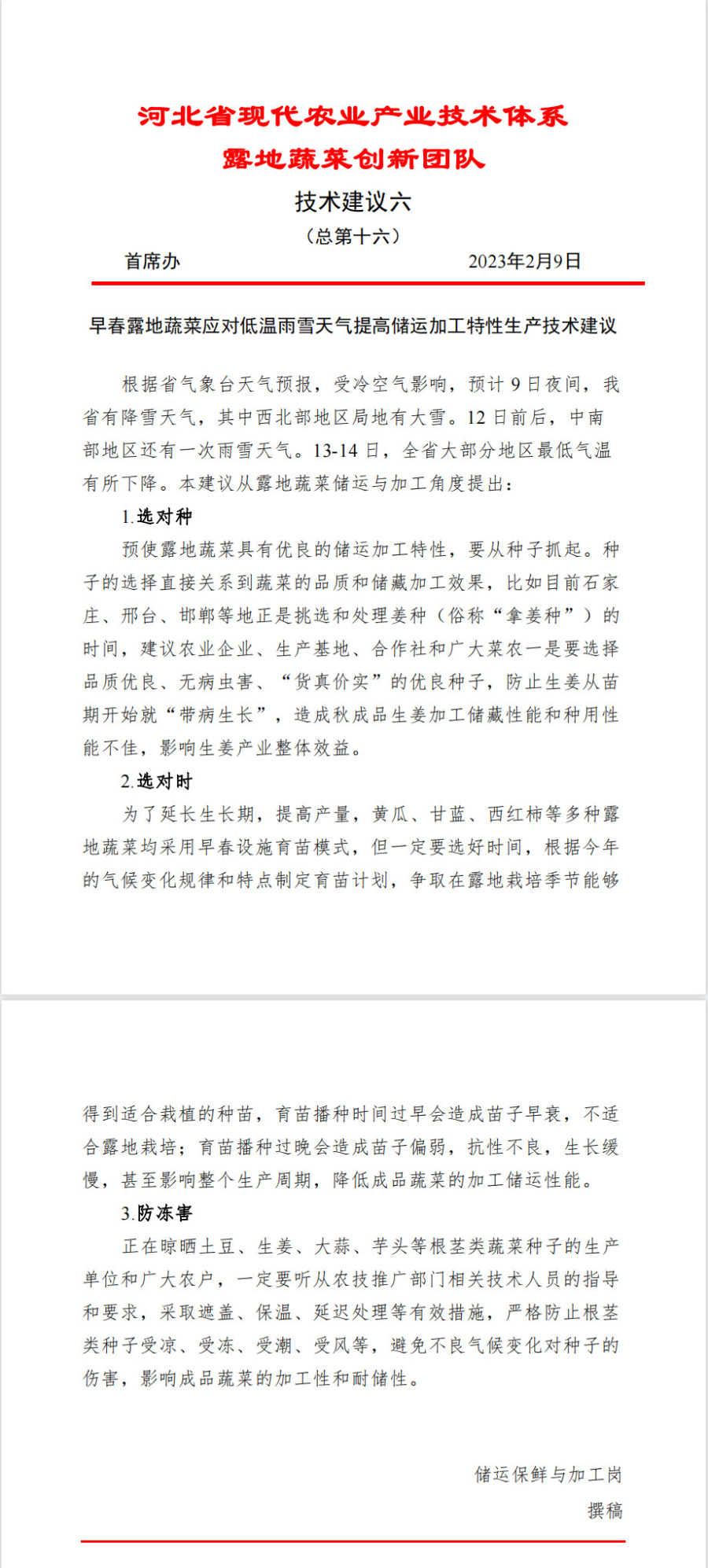根据省气象台天气预报,受冷空气影响,预计8日夜间到9日夜间,我省有降雪天气,其中西北部地区局地有大雪。12日前后,中南部地区还有一次雨雪天气。13-14日,全省大部分地区最低气温有所下降。 针对此次雨雪天气可能对早春蔬菜生产造成影响,依托我院信息与经济所的省产业体系露地蔬菜创新团队,紧急组织团队岗位专家及试验站长,制定了科学应对低温雨雪防冻“套餐配方技术”十项,并布署各岗站专家持续关注当前天气对蔬菜生产的影响,加强我省蔬菜产区生产和销售全产业链条的技术指导,助力春季蔬菜健康生产。