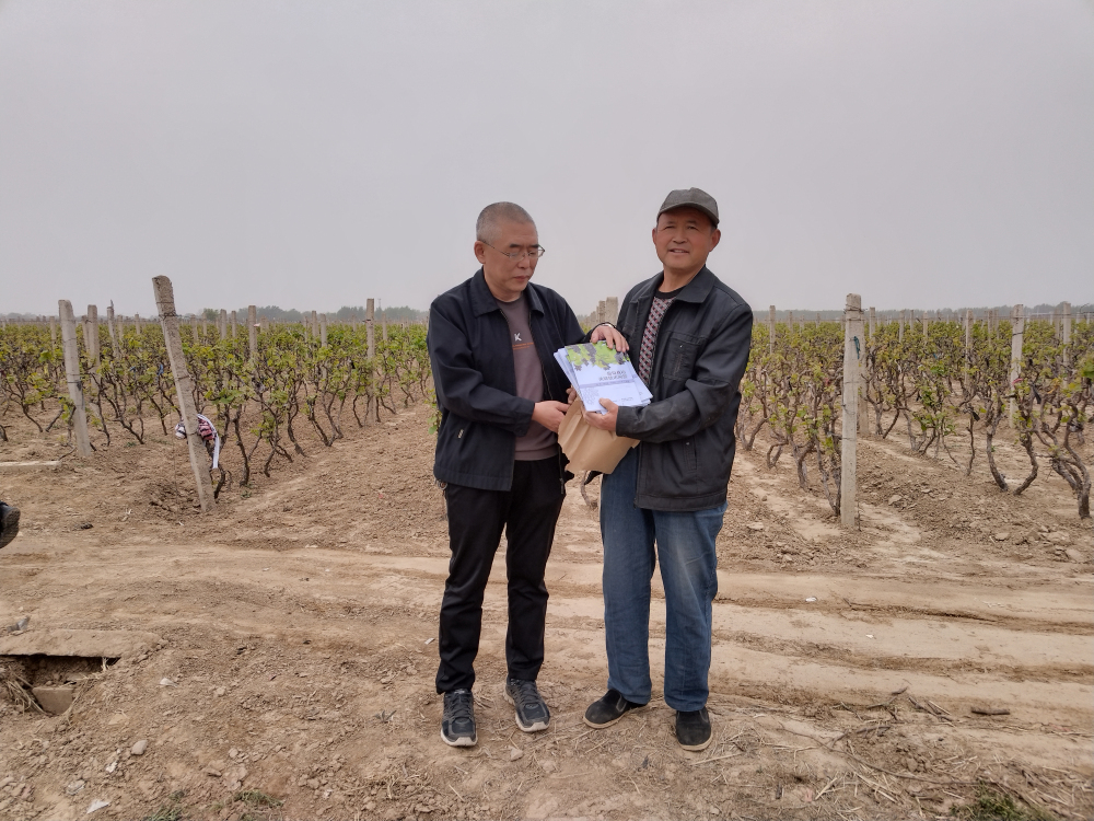 2023年4月13日,石家庄果树研究所葡萄研究室杨丽丽、宣立锋一行到邢台市威县洺州镇戚霍寨村和胡家屯村调研指导,现场指导露地葡萄春季栽培关键技术,并发放技术资料《葡萄栽培关键技术问答》100册。