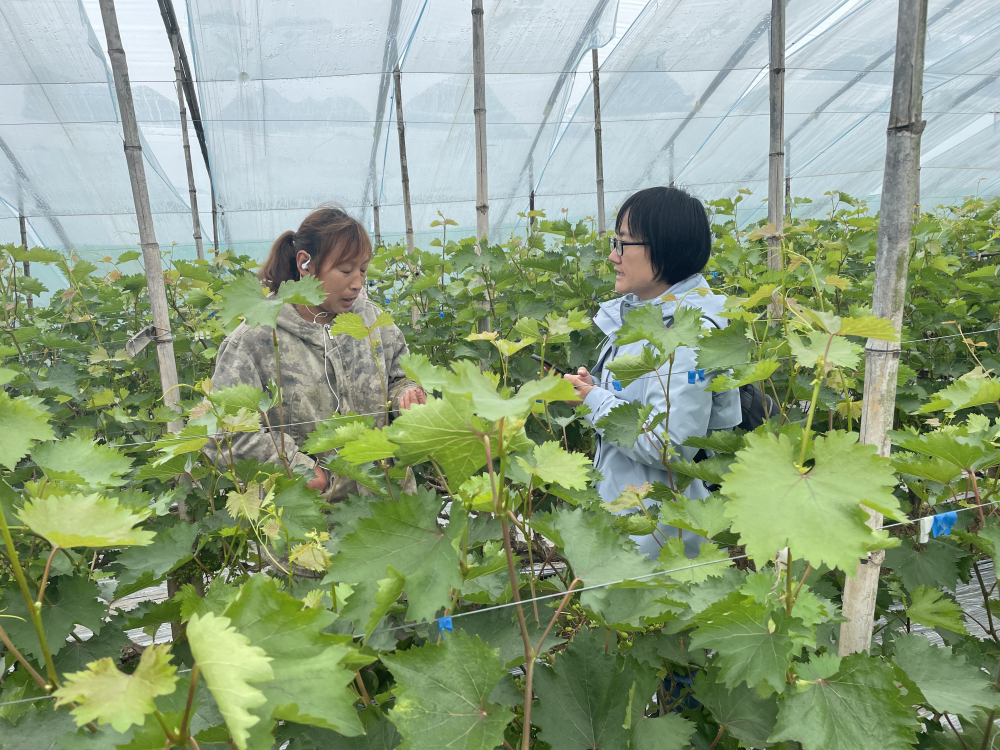 北埝头乡花园头村葡萄种植比较集中,约有大棚200余个,占地300余亩。目前当地正值葡萄转色期,白粉病、扇叶病偶有发生。张晓云副研究员就葡萄白粉病的症状识别及生防技术对种植户进行了具体指导,提出葡萄发芽前后喷施枯草芽孢杆菌菌剂预防白粉病的生防措施;针对农户提出的“葡萄大小粒”现象,建议来年花期前后控制水分和氮肥,并补充锌、硼等微量元素以减少该情况发生。