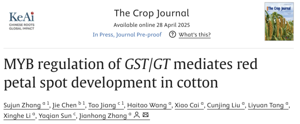 近日,河北省农林科学院棉花研究所分子育种研究室在《The Crop Journal》(影响因子6.0,中科院一区TOP)在线发表了题为“MYB regulation of GST/GT mediates red petal spot development in cotton”的研究论文。该研究表明亚洲棉中GaGT通过催化花青素合成最后一步的糖基化修饰,影响花青素合成,从而影响花基红斑形成。与此同时,该研究还提出GaMYB同时调控GaGST和GaGT参与亚洲棉花基红斑形成,并表明该机制在陆地棉和海岛棉中高度保守。
