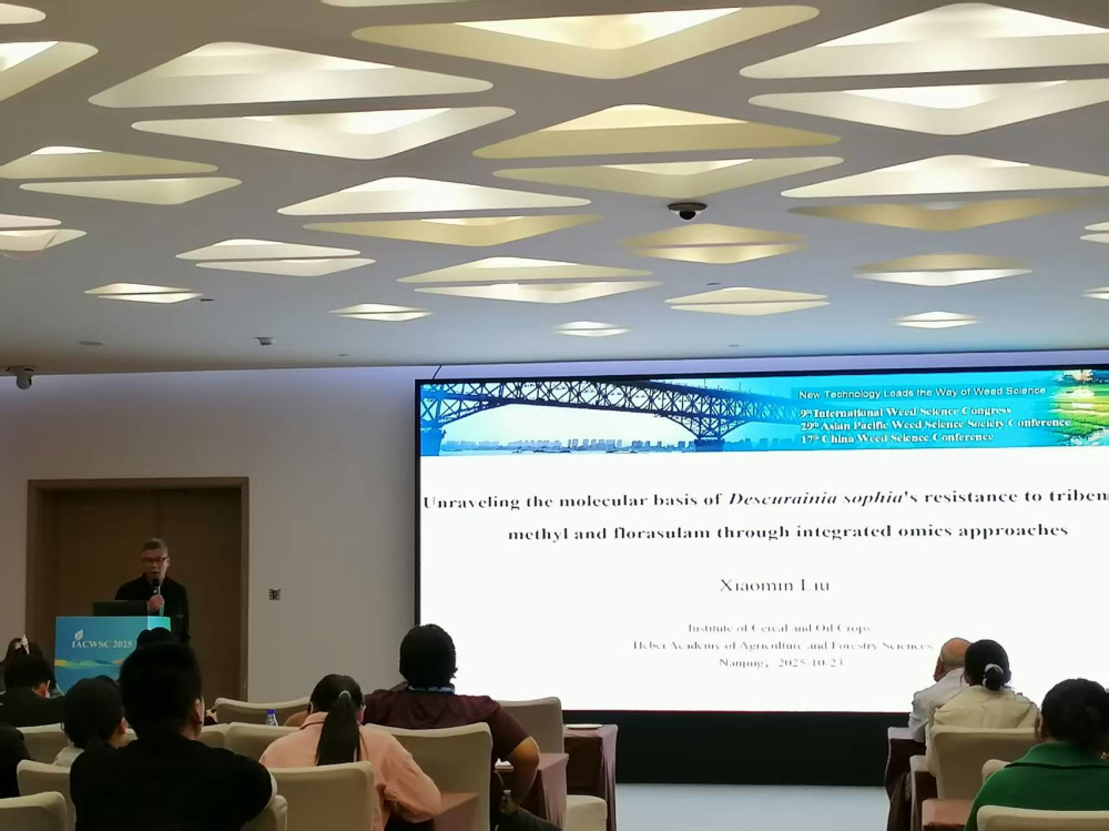 粮油所刘小民研究员和郭兵博博士分别在会上做了题为“Unraveling the molecular basis of Descurainia sophia's resistance to tribenuron-methyl and florasulam through integrated omics approaches”和“Design, synthesis, and biological activity of novel HPPD inhibitors containing cinnamic acid”的学术报告,展示了粮油所在杂草对除草剂的抗性形成机制及新型除草剂分子开发方面的最新研究进展。会议期间,粮油所科研人员认真聆听了杂草基因组学、除草剂抗性机制和治理、杂草综合防控等专题报告,深入了解杂草科学领域的最新研究动态与发展趋势。