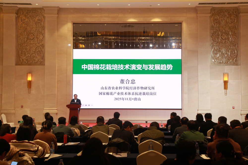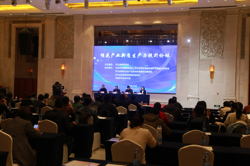 为进一步推动河北省棉花产业绿色、高效、可持续发展,展示棉花产业科技成果和先进技术,打造良性高效的棉花产业链,2025年11月6日,以“聚新赋能、提质拓链”为主题的棉花产业新质生产力提升论坛在唐山丰南成功召开,此次论坛由河北省棉花学会主办,河北省农林科学院棉花研究所、唐山市丰南区人民政府、农业农村部黄淮海半干旱区棉花生物学和遗传育种重点实验室、河北省现代农业产业技术体系棉花创新团队联合承办。国家、河北省棉花产业技术体系有关专家,以及来自棉花科研、教学、生产管理、涉棉新型经营主体、合作社、种子企业、棉花加工企业等会员代表一百五十余人参会,院科研管理部、成果转化部相关负责同志出席论坛。