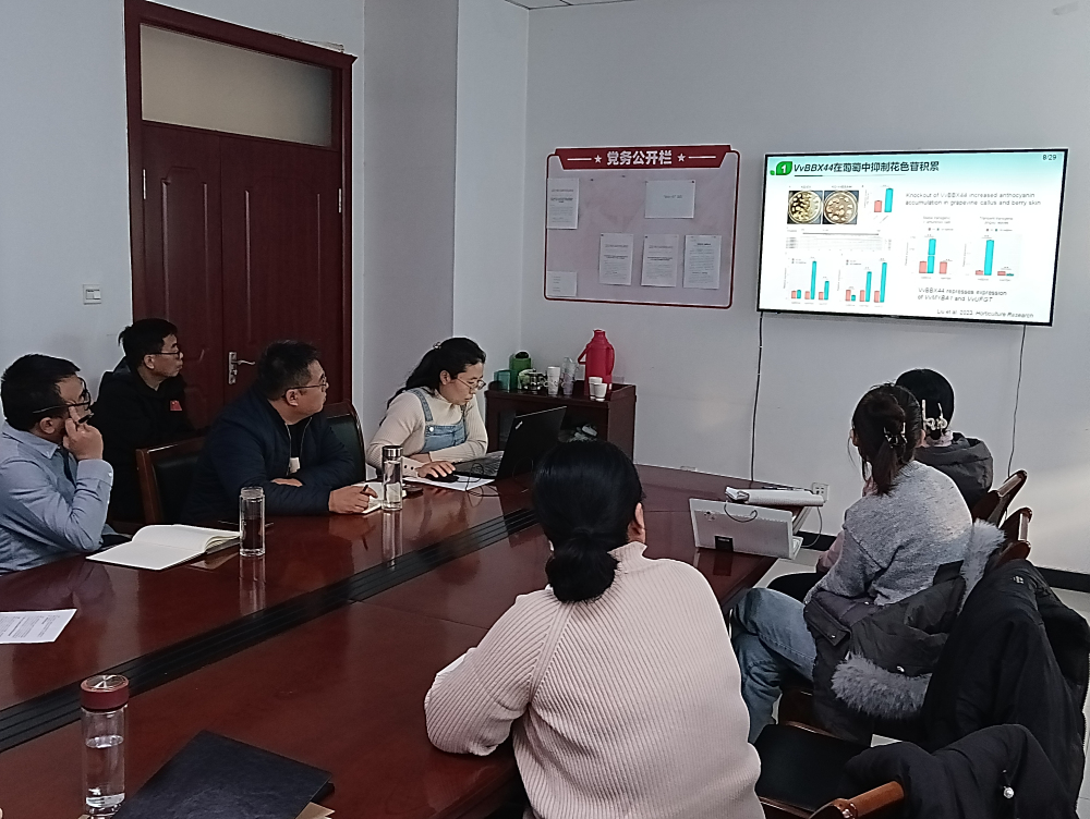 报告会上,五位新进博士分别围绕食品科学、植物分子机制及采后生物学等领域,分享了各自的学术成果,展示了扎实的研究基础与新颖的科学视角。李少辉博士分享了小米酸面团的研制及其功能应用;刘文文博士后分享了葡萄VvBBX44负反馈调控花色苷和葡萄基因组体细胞变异群体遗传学规律;张军淼博士聚焦药食同源资源,分享了猴头菇活性肽的表征及其肠道免疫增强作用机制研究;许大金博士分享了凝集素类受体激酶调节植物生长与环境适应性的分子机制;张莹博士后聚焦在梨采后淀粉降解和果胶代谢相关基因分析。报告会现场气氛热烈,大家对报告中的科学问题、技术要点进行了深入的讨论。
