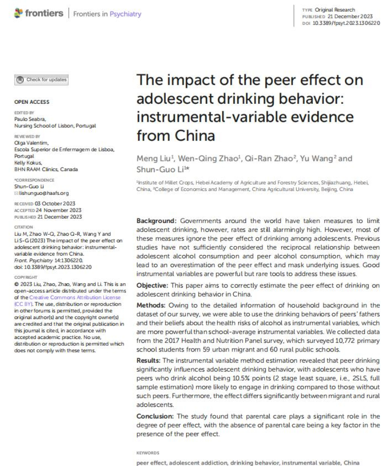 近日,我院谷子所杂粮栽培经济团队在《Frontier in Psychiatry》杂志在线发表了SSCI论文“The impact of the peer effect on adolescent drinking behavior:instrumental-variable evidence from China(同伴效应对青少年饮酒行为的影响:来自中国的工具变量的证据)”,论文影响因子4.7,创我院社科类论文影响因子新高。文章针对以往研究没有充分考虑青少年饮酒和同伴饮酒之间的相互关系,为正确评估中国青少年饮酒行为的同伴效应,对59所城市学校和60所农村公立学校的10772名小学生调查数据进行工具变量估计,结果显示,同龄人饮酒显著影响青少年的饮酒行为,且青少年饮酒行为受同龄人饮酒的影响较同龄人不饮酒的影响高10.5百分点。研究发现,父母关爱对同伴效应的程度起着重要作用,父母关爱的缺失是同伴效应存在的关键因素。