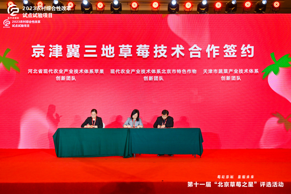 为推动京津冀三地草莓产业技术协同创新,助力京津冀草莓产业高质量发展,北京市特色作物创新团队(依托单位:北京市农业技术推广站)、天津市蔬菜产业技术体系创新团队(依托单位:天津市农业科学院)和省体系苹果创新团队(依托单位:河北省农林科学院石家庄果树研究所),现场共同签订了京津冀草莓技术合作协议。本协议旨在通过资源共享、技术协同和优势互补,重点围绕草莓新品种引进筛选、新技术试验示范、人才交流培养及产业宣传推介等方向深化合作,构建区域联动、互利共赢的草莓产业技术发展新格局。协议的签订必将将有力促进三地草莓产业融合发展,更好为乡村振兴注入新动能。