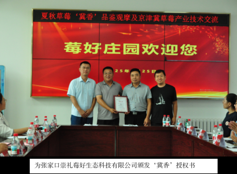 自2022年起,草莓创新团队与张家口崇礼莓好生态科技有限公司及河北涞源高地农业科技有限公司进行四季草莓新品种‘冀香’及绿色生产技术应用与示范,取得了显著成效。2022年至2025年张家口崇礼区老芽茬村‘莓好庄园’及保定涞源县白石山村‘高地农业’试验示范了优质、丰产、抗病、耐贮运四季草莓新品种‘冀香’,两个基地均采用了稻壳及秸秆改良土壤,充分利用有机肥,疏花疏果,蜜蜂辅助授粉,黄板诱杀蚜虫、蓝板诱杀蓟马,异色瓢虫防控蚜虫,捕食螨防控红蜘蛛等绿色生产技术手段,保证了生产出的草莓果品绿色、优质、安全。两个基地的公司分别与河北省农林科学院石家庄果树研究所签订了‘冀香’品种经营权转让协议。