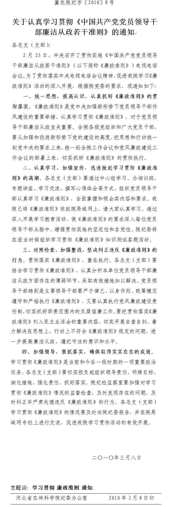 关于认真学习贯彻《中国共产党党员领导干部廉洁从政若干准则》的通知