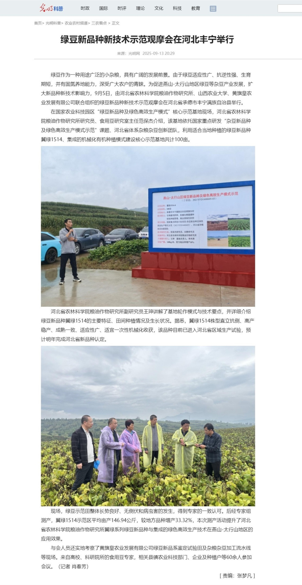 绿豆作为一种用途广泛的小杂粮,具有广阔的发展前景。由于绿豆适应性广、抗逆性强、生育期短,并有固氮养地能力,深受广大农户的青睐。为促进燕山-太行山地区绿豆等杂豆产业发展,扩大新品种新技术影响力,9月5日,由河北省农林科学院粮油作物研究所、山西农业大学、黄旗皇农业发展有限公司联合组织的绿豆新品种新技术示范观摩会在河北省承德市丰宁满族自治县举行。