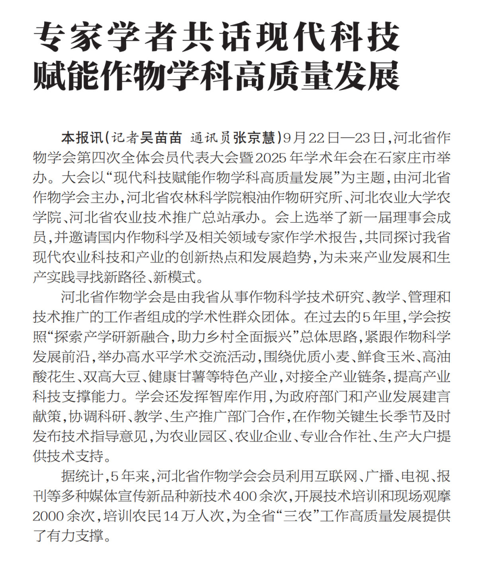 本报讯(记者吴苗苗 通讯员张京慧)9月22日—23日,河北省作物学会第四次全体会员代表大会暨2025年学术年会在石家庄市举办。大会以“现代科技赋能作物学科高质量发展”为主题,由河北省作物学会主办,河北省农林科学院粮油作物研究所、河北农业大学农学院、河北省农业技术推广总站承办。会上选举了新一届理事会成员,并邀请国内作物科学及相关领域专家作学术报告,共同探讨我省现代农业科技和产业的创新热点和发展趋势,为未来产业发展和生产实践寻找新路径、新模式。