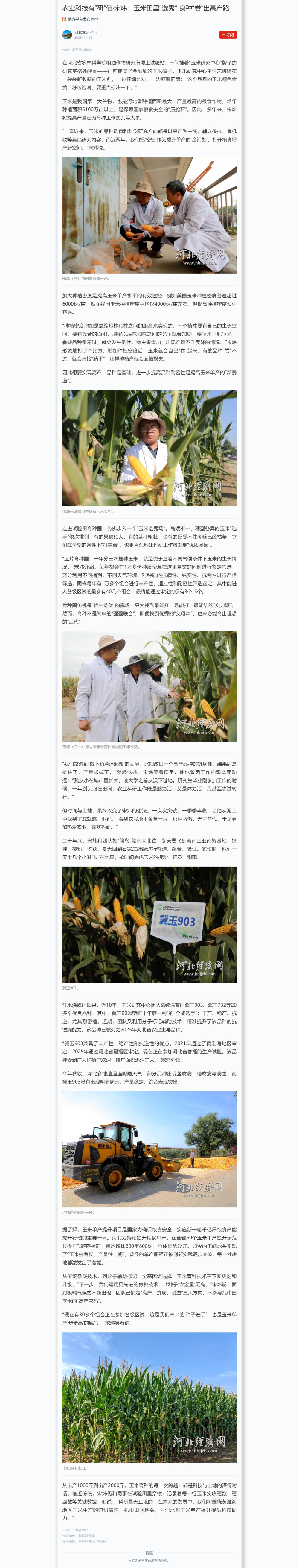 从亩产1000斤到亩产2000斤,玉米育种的每一次跨越,都是科技与土地的深情对话。临近傍晚,宋炜仍和同事在试验田里穿梭,记录着每一行玉米实收穗数、穗腐数等关键数据,他说:“科研是无止境的,在未来的发展中,我们将围绕黄淮海地区玉米生产的迫切需求,扎根田间地头,为河北省玉米单产提升提供科技助力。”