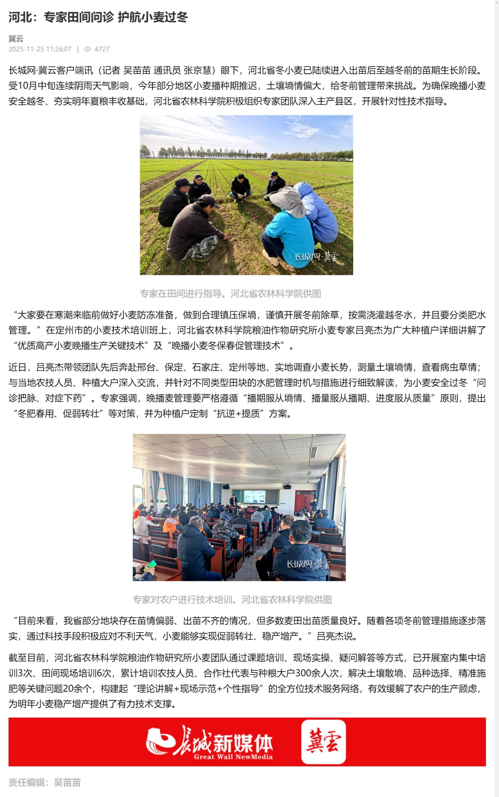 眼下,河北省冬小麦已陆续进入出苗后至越冬前的苗期生长阶段。受10月中旬连续阴雨天气影响,今年部分地区小麦播种期推迟,土壤墒情偏大,给冬前管理带来挑战。为确保晚播小麦安全越冬、夯实明年夏粮丰收基础,河北省农林科学院积极组织专家团队深入主产县区,开展针对性技术指导。