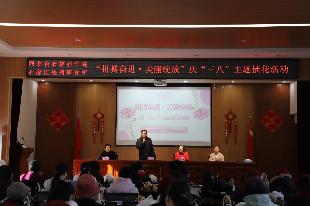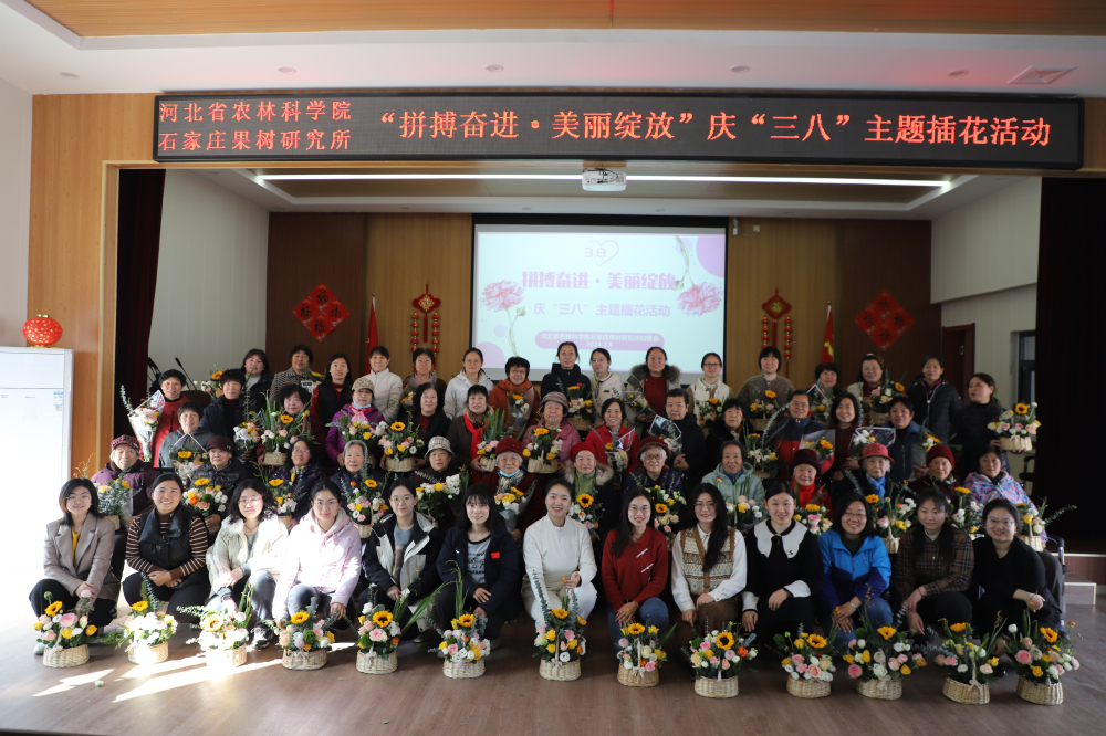 2024年3月8日,为庆祝“三八”妇女节,石家庄果树研究所妇委会组织开展“拼搏奋进·美丽绽放”主题插花活动。庞昭进所长代表所领导班子向广大在职、离退休女职工致以节日的问候和祝福。随后,女职工在插花老师的指导下,进行了插花创作,有的错落有致,有的花团锦簇,每一件作品都凝结了女职工对生活的热爱和对美的追求。广大女同胞在鲜花和欢笑中度过了一个难忘的节日。此次活动的开展,提升了广大女职工的审美品位,增进了姐妹感情,活跃了工作气氛。全所共70余名在职、离退休女职工参加插花活动。