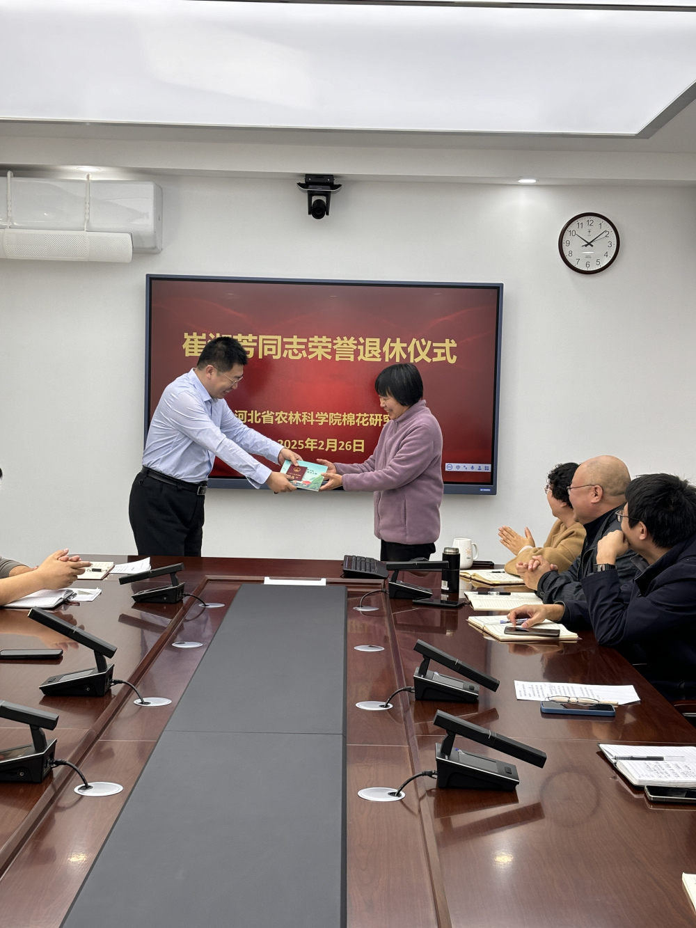 2025年2月26日,棉花所举办崔淑芳同志荣誉退休仪式,棉花所所长、党总支书记张建宏主持,所领导班子、所中层领导、品种资源研究室全体成员等同志参加。