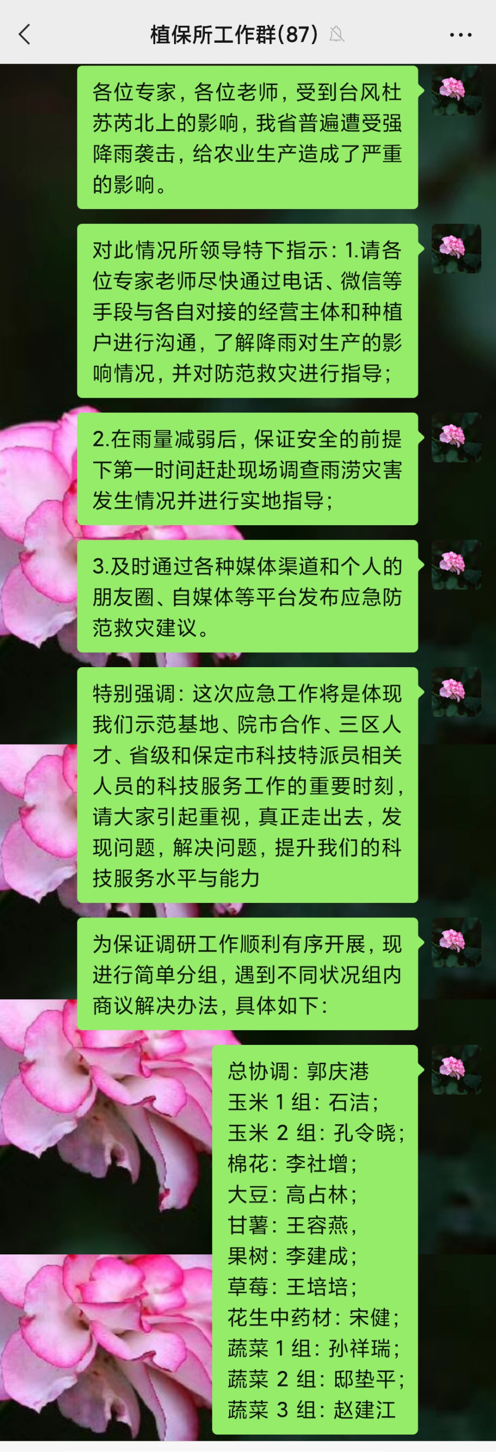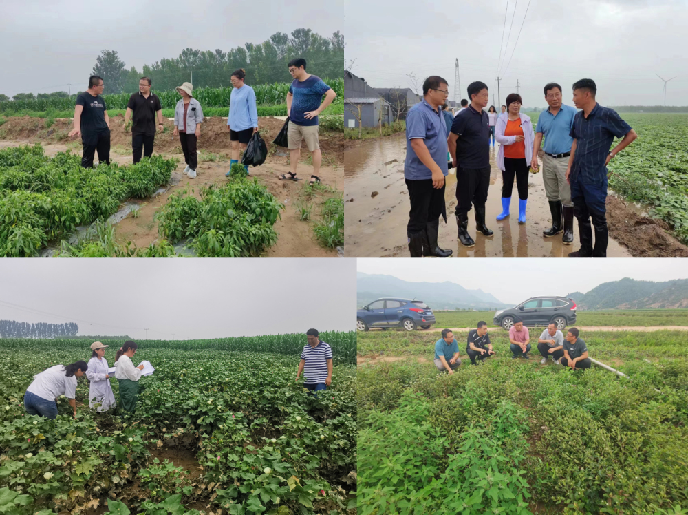 深入灾区,实地调研。在雨量减弱后,保证安全的前提下,植保所组织专家分别针对玉米、棉花、大豆、甘薯、辣椒、果树、蔬菜等作物,第一时间赶赴现场调查雨涝灾害发生情况并进行实地指导。截止发稿,全所专家通过微信、电话开展技术指导130余次,深入40多个县(区),开展现场调研指导180余人次。