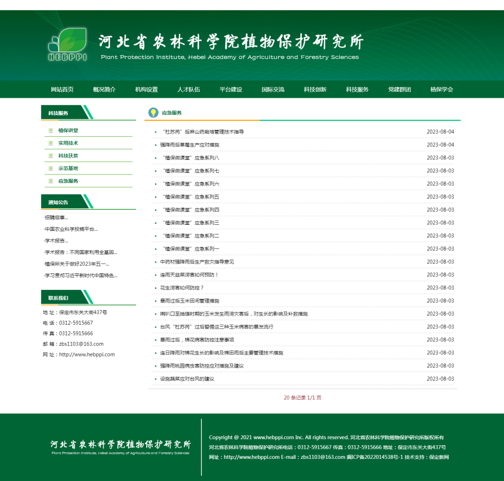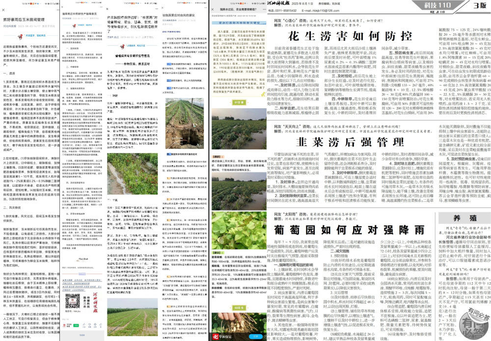 多种形式,宣传报道。及时将应急技术在燕赵农科、河北科技报、河北省植保协会、院所网站上发布,共发布技术15条。研究所网站单独设立“应急服务”版块,及时跟进发布雨涝灾害后各类作物应急管理措施。所职工积极通过个人微信朋友圈、自媒体等平台转发各项应急防范救灾建议。同时与保定气象局对接,“植保微课堂”应急技术系列结合天气预报,在学习强国、保定天气、保定市新闻传媒中心客户端等多家媒体渠道传播转载。
