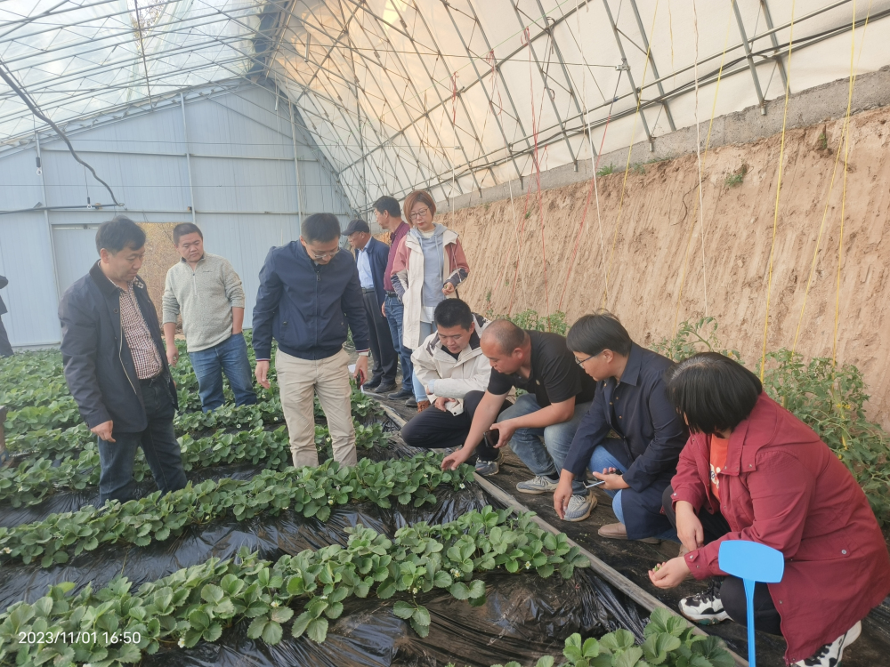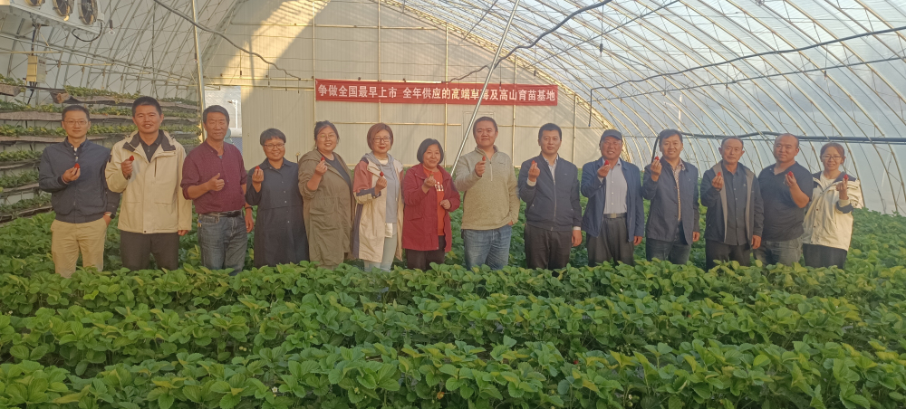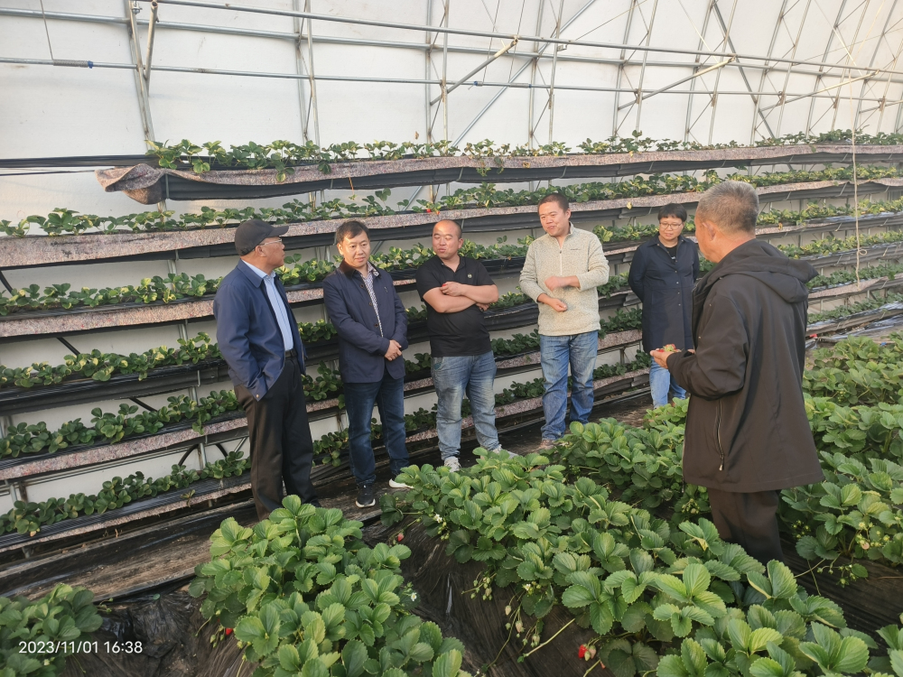 2023年11月1日,河北省农林科学院石家庄果树研究所草莓研究团队对接国家特菜体系草莓岗位专家王桂霞研究员团队、国家特菜体系保定草莓综合试验站站长李青云教授及主要成员张⼴华教授、保定市草莓研究所赵辉所长及⽥锋正⾼级农艺师赴保定市博士农产顺平县沃野草莓农业有限公司进行考察调研。在当地农业农村局局长刘春晖、顺平县沃野草莓农业有限公司负责人杨玉想等人的带领下,岗站专家实地查看了设施草莓的种植情况,并从品种、品质、种苗、绿色生产及品牌打造等方面进行了深入交流,为加快实现顺平农业强县场景贡献力量,把精品草莓做成强县富民的优势特色产业。随后,岗站专家一行辗转来到河北保定涞源高地农业科技开发有限公司,考察了这里的四季草莓、冷藏苗促早上市草莓、以及草莓种苗的繁育情况,并探讨了如何对石家庄果树研究所自育新品种(系)的共同开发。