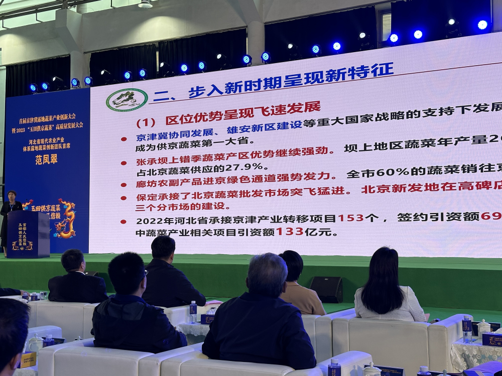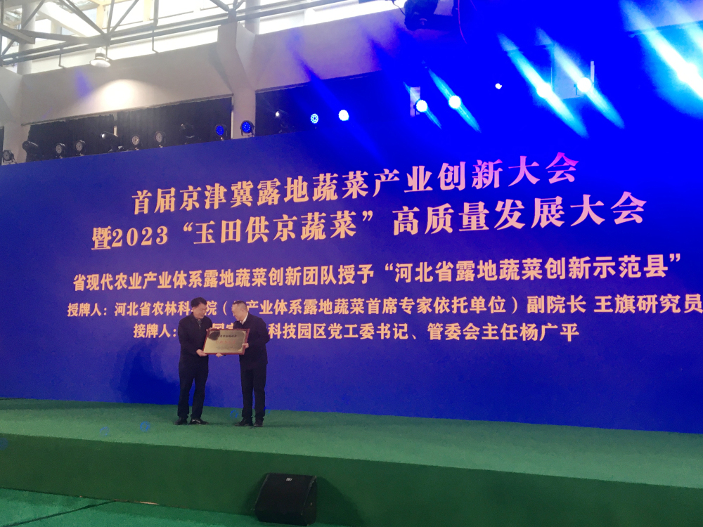 近日,由河北省现代农业产业体系露地蔬菜创新团队、唐山市农业农村局、中共玉田县委、玉田县人民政府联合主办的“首届京津冀露地蔬菜产业创新暨2023‘玉田供京蔬菜’高质量发展大会”在玉田召开。我院副院长王旗、科技成果转化部部长王国印以及省农业农村厅、省农业特色产业技术指导总站等相关领导出席会议。来自京津冀农业主管部门、科研机构、有关协会、涉农企业,唐山市、玉田县党政领导、主管部门和种植大户,省体系露地蔬菜创新团队岗站专家与团队成员以及国家、省、市、县级新闻媒体等约300余人参加大会。
