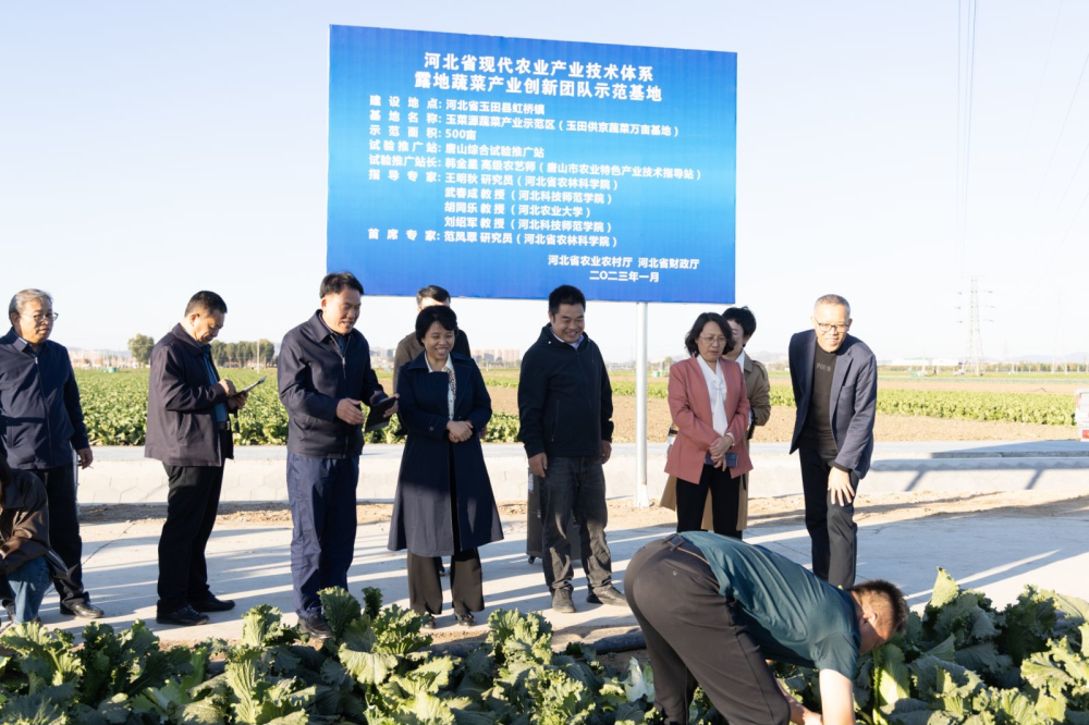在基地观摩环节,王旗副院长、王国印部长以及省农业农村厅、省农业特色产业技术指导总站等相关领导在玉田供京蔬菜万亩基地—“玉菜源”产业示范区现场考察了露地蔬菜创新团队示范的新品种、新技术等科技成果,为丰富唐山露地蔬菜新品种,满足市场多样化优质菜品需求提供了科技资源。