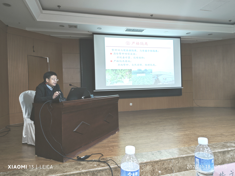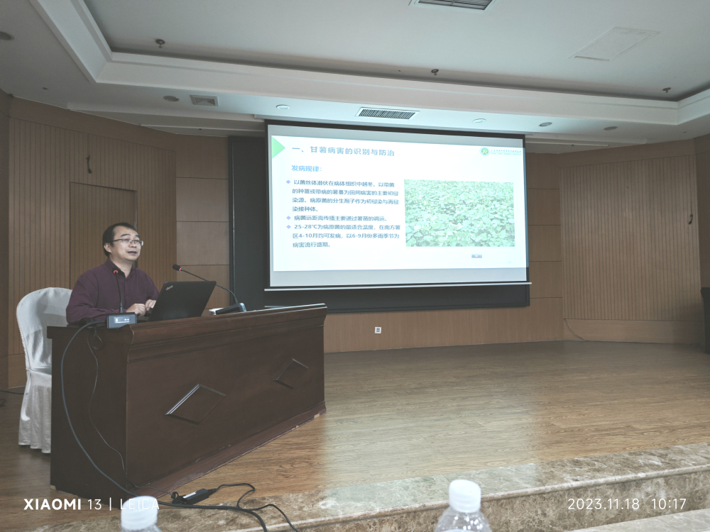 国家甘薯产业技术体系病毒病防控岗位专家、河南省农业科学院植物保护研究所副所长张振臣研究员重点就甘薯主要病毒病的识别与防控技术进行了系统介绍;国家甘薯产业技术体系虫害防控岗位专家、我院植物保护研究所副所长陈书龙研究员以“提高风险意识推动绿色防控”为题,从甘薯生产实际病虫害如何开展绿色防控角度为参会代表进行了讲解;国家甘薯产业技术体系广州综合试验站站长、广东省农业科学院作物研究所甘薯研究团队黄立飞研究员就近年来南病北移逐年加重的严峻形势,与参会代表共同研讨了如何识别南方病虫害及其发病规律和危害,并针对性的制定了各种病害的防控方案;河北省薯类体系甘薯专用品种筛选与评价岗位专家、粮油所甘薯研究团队马志民研究员就最新集成的“甘薯宽沟横插增密高效生产技术”在会上做典型发言。随后,与会专家针对农户提出的各种问题进行了逐一解答。