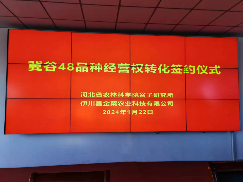 2024年1月22日,国内首个高油酸加工专用谷子品种冀谷48品种经营权转让仪式在伊川县金粟农业科技公司科技报告厅举行。河北省农林科学院成果转化部李顺国部长、河北省农林科学院谷子所王根平副所长、伊川县科技和工业信息化局李根六副局长、伊川县金粟农业科技有限公司申少波总经理等10余人参加会议。
