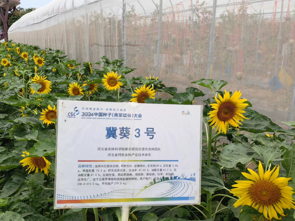 2024年3月中下旬,河北省农林科学院棉花研究所遗传育种团队培育的油葵新品种冀葵3号在海南省三亚市“国家现代农业(种业)产业园”——2024中国种子(南繁硅谷)大会进行了品种展示。金灿灿的油葵花为全国种业成果汇聚、万果竞相斗艳的现代农业产业园增添了一道亮丽的风景。