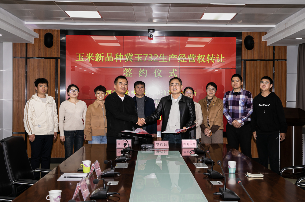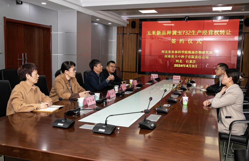 4月3日,粮油作物研究所与河南省天中种子有限责任公司在石家庄市举行“冀玉732”玉米新品种经营权转让签约仪式。粮油作物研究所书记李辉、玉米中心主任宋炜、河南省天中种子有限责任公司总经理路向阳、海南芙锐思植物新品种科技发展有限公司代表许蒙蒙等参加了签约仪式。