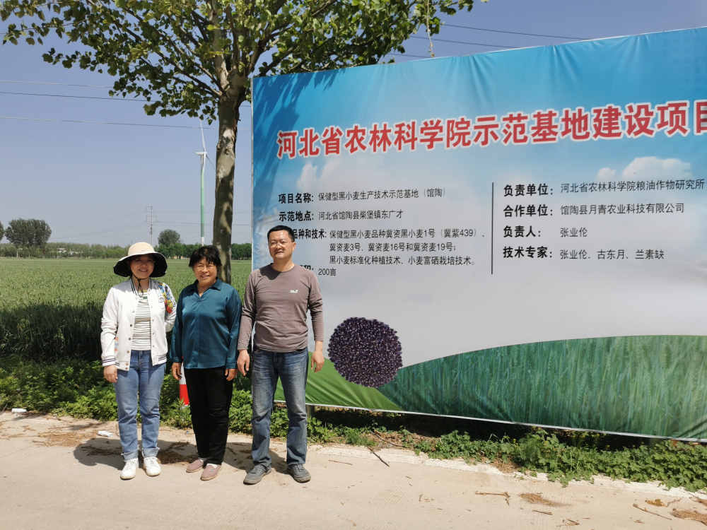 今年粮油所在该基地示范种植了冀紫439和黑小麦新品种冀资麦16号、冀资麦19号。冀资麦16号是一个多穗型品种,高产稳产,该品种在河北省彩色小麦区试中,平均亩产比对照冀资黑小麦1号增产6.2%,并且籽粒富含矿质元素镁和钙;冀资麦19号属于优质中强筋品种,适宜加工馒头、面条、水饺。当前,在农场内种植的三个品种均已抽穗,长势喜人,做好一喷三防,可以确保今年还是个丰产年。在另一块地种植的冀紫439,由于土壤沙性强,漏水漏肥,虽然抽穗已完成,但总体上植株偏矮,长势较弱,繁茂性不强。针对这块地黑小麦的长势,专家提出少量多次浇水,配合喷施磷酸二氢钾和水溶性氨基酸叶面肥增加粒重,确保水肥供应,争取最佳产量潜力。