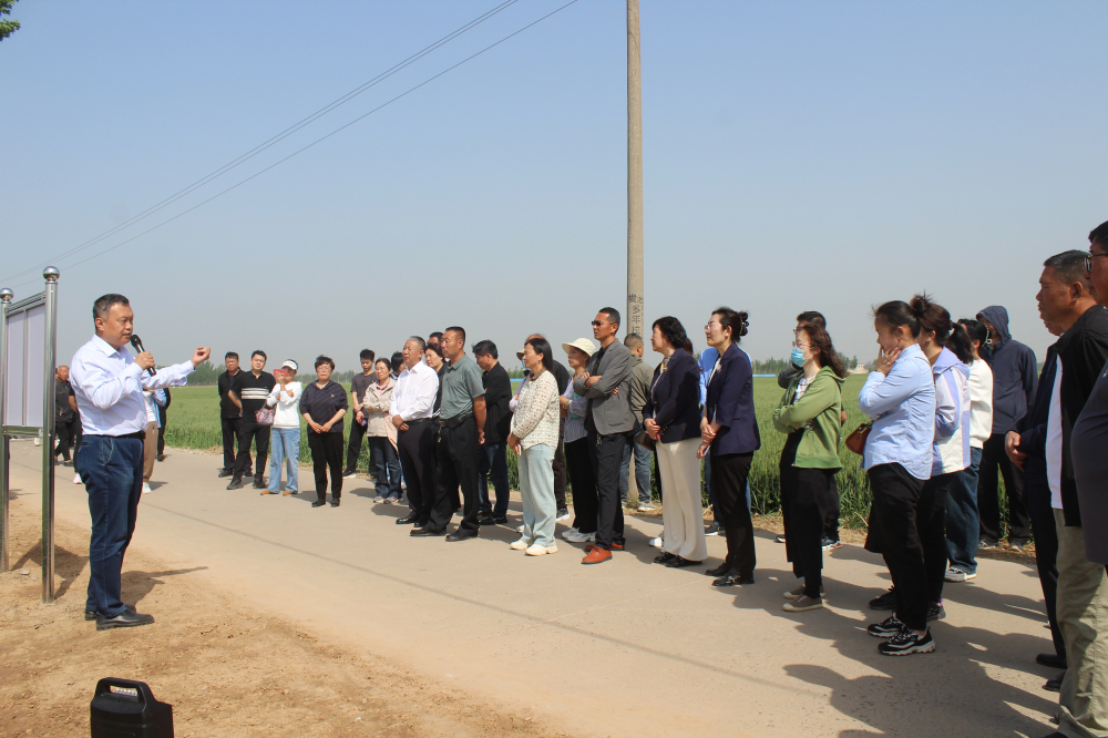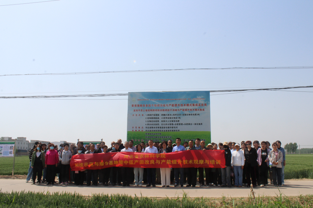 基地观摩活动中,贾良良研究员首先详细介绍了枣强县科技示范基地建设情况;资环所张静博士介绍了土壤改良与产能提升田间试验示范情况;旱作所曹彩云研究员就水肥一体化技术田间示范作了详细介绍。该试验示范区主要通过耕层扩容增碳、结构障碍消减、生物定向培育、养分水分协同等技术组装,形成小麦玉米深耕增碳减肥综合管理技术、结构障碍粮田产能提升综合管理技术等综合模式,解决土壤障碍因子,提高土壤质量、增加农作物产量、改善生态环境。目前示范区小麦已进入抽穗期,长势整齐,丰收在望,示范效果显而易见。