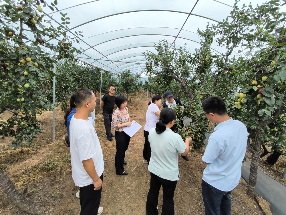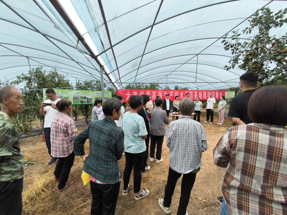 2024年9月10日,河北省农林科学院石家庄果树研究所在赞皇县举办大枣优质高效生产技术示范基地现场观摩活动。观摩活动同时邀请省农业农村厅特色产业技术指导总站刘敏彦站长、省林业和草原科学研究院正高级工程师王振亮及省林业和草原技术推广总站正高级农艺师郑丽锦组成考察组对实施效果进行了现场考察。专家对所承担的示范基地项目开展的工作表示肯定,一致认为,示范效果显著,科技服务及时到位,现场宣传技术标牌醒目,依托的大河道大枣专业合作社在当地认可度高,对赞皇枣产业的发展起到了较强的辐射带动作用。院科技成果转化部、石果所、赞皇县林业局有关负责同志,以及大枣种植大户、技术人员等50余人参加活动。