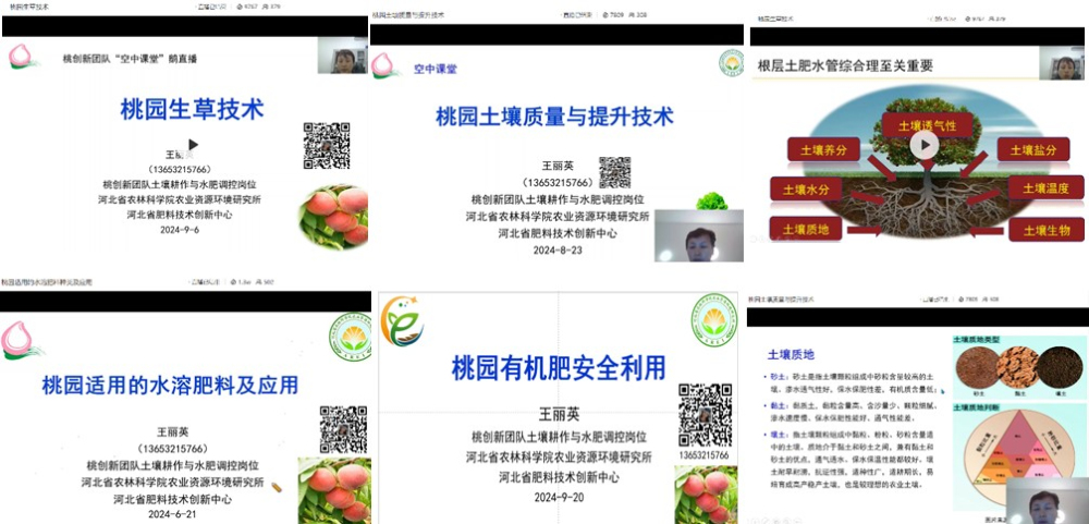 我院资环所、省现代农业产业技术体系桃创新团队土壤耕作与水肥调控岗位专家王丽英研究员,今年6月21日、8月23日、9月6日和9月20日,通过“鹅直播空中课堂”为创新团队岗站专家和全省桃农开展了 桃园土肥水管理方面的系列培训,分别讲授了“桃园适用的水溶肥料及应用”、“桃园土壤质量与提升技术”、“桃园生草技术”和“桃园有机肥安全利用”四堂课程。课程讲解了桃树生长发育规律、养分吸收规律、土壤质量评价指标、有机肥和水溶肥料、桃园生草等知识,以及水肥一体化、土壤质量提升、自然生草和人工生草、有机肥安全利用等技术,累计在线听课人数1246人次,热度4.0万。系列培训为我省桃创新团队的岗站专家和桃农朋友普及了桃园土肥水管理知识、技术和标准,解答了心存已久的土肥水管理问题,得到了桃农的认可和欢迎。