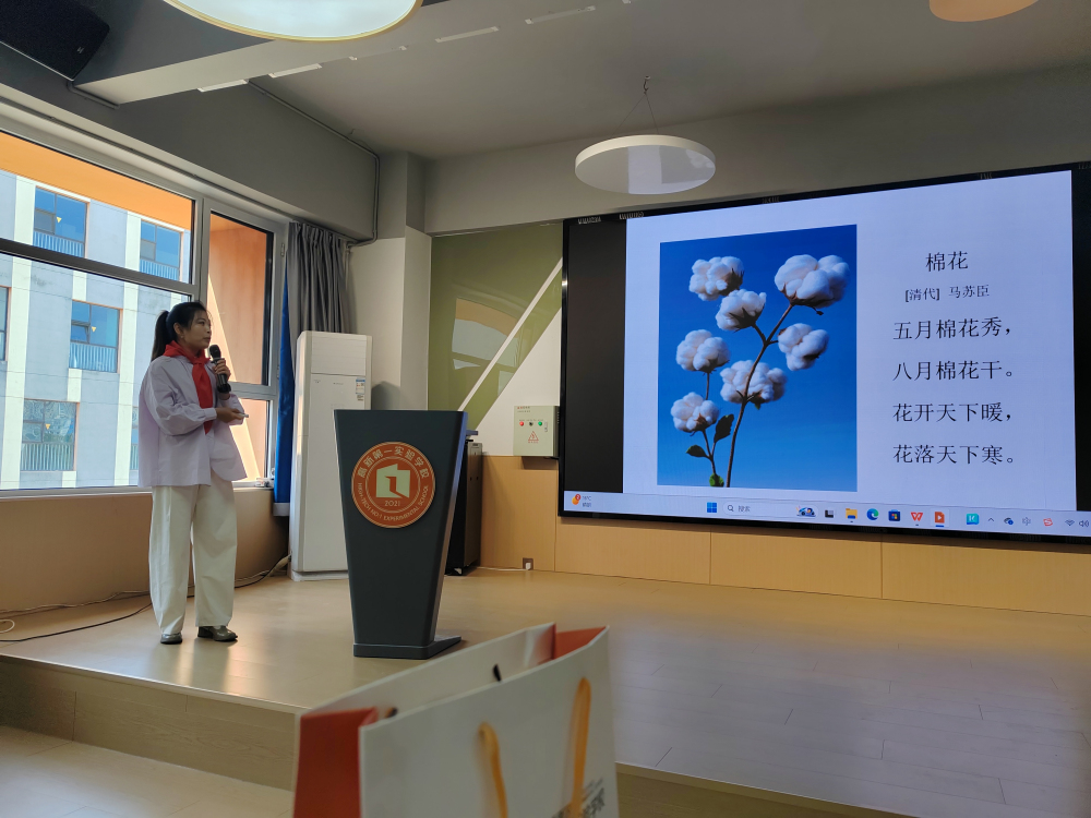 仪式上,棉花所副所长祁虹致词,对学校“一亩三分地”农场的开耕表示祝贺,鼓励孩子们通过学习和实践领悟农业科学和生命的奥妙,并接受学校赠予的锦旗。随后棉花所李丹、耿昭分别为同学们讲授了主题为“奇妙的微生物”和“小棉花作用大”的科普知识,并指导同学们在实践田现场完成了棉花播种。